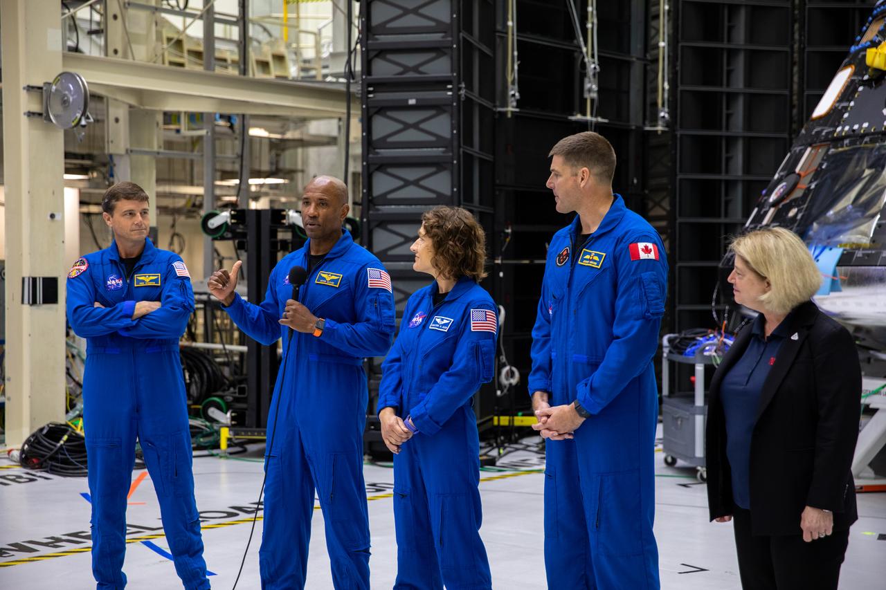 Artemis II crew members, shown inside the Neil Armstrong Operations and Checkout Building at NASA’s Kennedy Space Center in Florida, stand in front of their Orion crew module with NASA Deputy Administrator Pam Melroy on Aug. 8, 2023. From left are: Reid Wiseman, commander; Victor Glover, pilot; Christina Hammock Koch, mission specialist; and Jeremy Hansen, mission specialist. The crew module is undergoing acoustic testing ahead of integration with the European Service Module. Artemis II is the first crewed mission on NASA’s path to establishing a long-term lunar presence for science and exploration under Artemis.