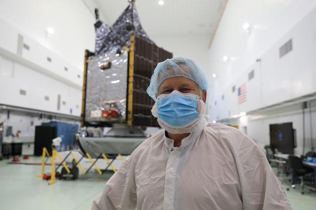 Psyche Project Manager Henry Stone, of NASA’s Jet Propulsion Laboratory, is photographed with the spacecraft by media inside a cleanroom at the Astrotech Space Operations Facility near Kennedy Space Center in Florida on Aug. 11, 2023. Psyche will launch atop a SpaceX Falcon Heavy rocket from Launch Complex 39A at Kennedy to explore a metal-rich asteroid. Launch is targeted for Oct. 5, 2023. Riding with Psyche is a pioneering technology demonstration, NASA’s Deep Space Optical Communications (DSOC) experiment.