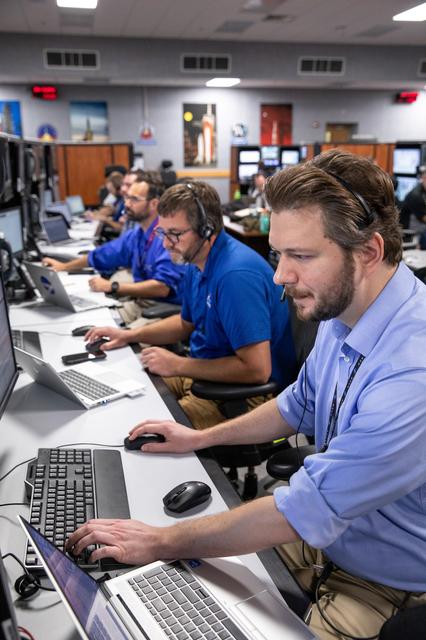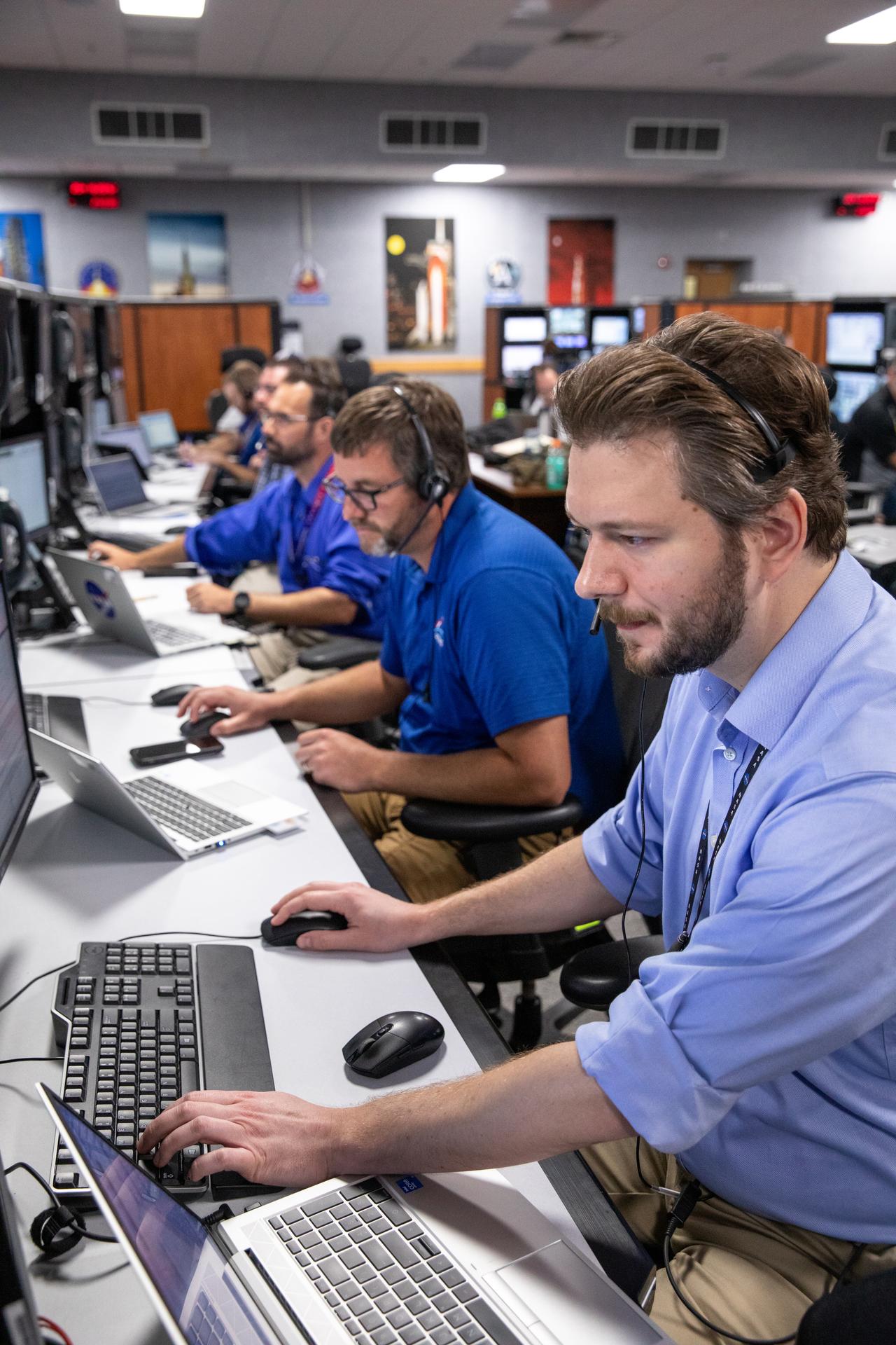 Members of the Artemis II launch team, including personnel with NASA’s Exploration Ground Systems and contractor Jacobs, monitor activities during the Artemis II terminal countdown simulation inside Firing Room 1 in the Launch Control Center at NASA’s Kennedy Space Center in Florida on Monday, Sept. 11, 2023. This is part of a series of simulations to help the team prepare for the launch of Artemis II, the first mission with astronauts under Artemis that will test and check out all of the Orion spacecraft’s systems needed for future crewed missions.