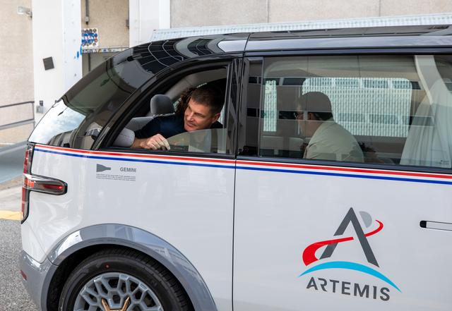 NASA astronaut Jeremy Hansen, left, sits inside one of the crew transport vehicles (CTVs) outside of the Neil A. Armstrong Operations and Checkout Building at Kennedy Space Center in Florida on Tuesday, Sept. 19, 2023. The CTVs will carry Hansen, along with fellow NASA astronauts Christina Koch, Reid Wiseman, and Victor Glover, to Kennedy’s Launch Complex 39B for liftoff of the Artemis II mission. The specially designed, fully electric, environmentally friendly vehicles were manufactured by Canoo Technologies, Inc. of Torrance California.