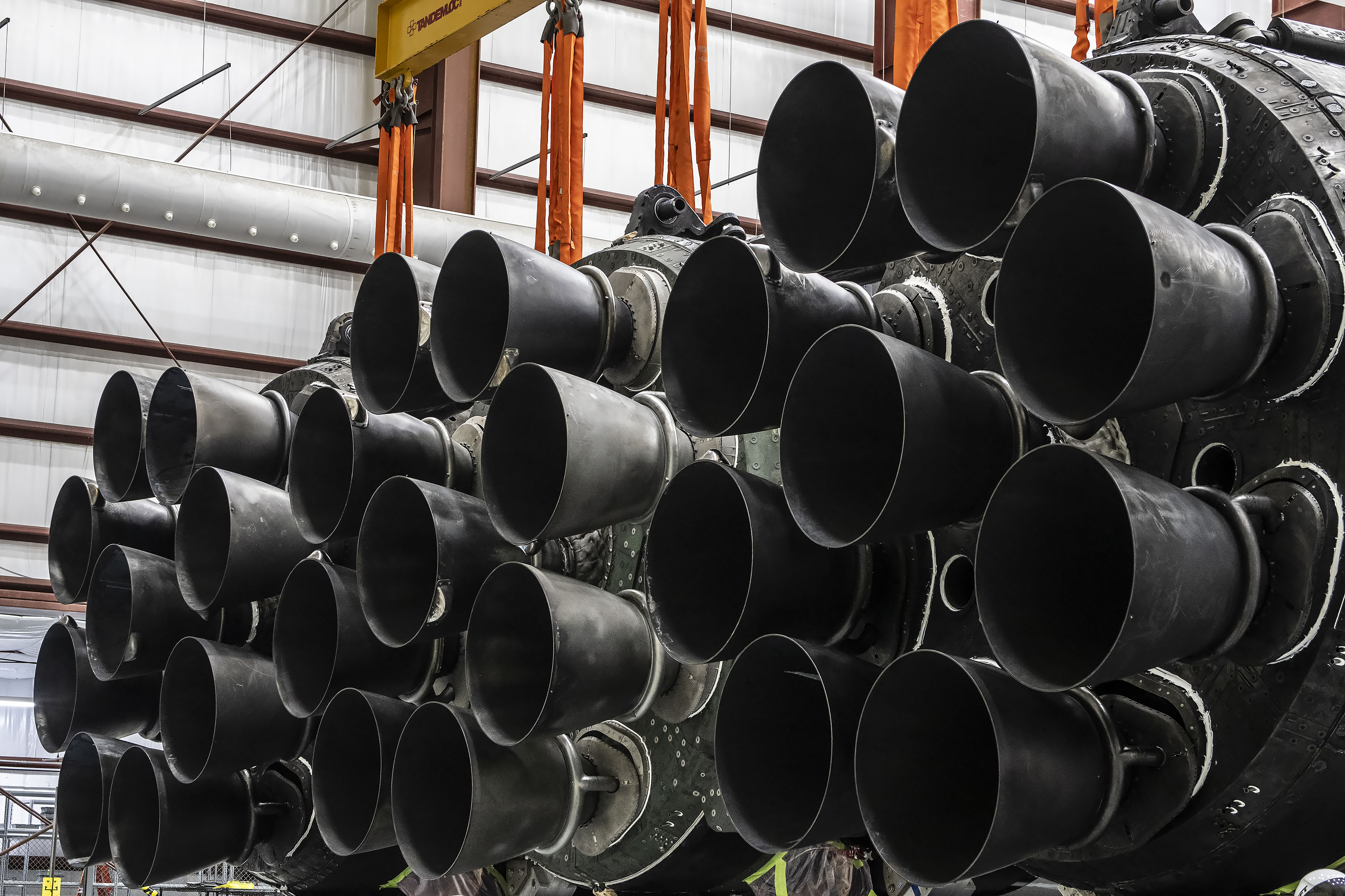 Photos of the Falcon Heavy rocket that will launch NASA's Psyche mission in the hangar at Launch Complex 39A at Kennedy Space Center in Florida before it rolled out to the pad for a static fire test as part of preparations for the journey to a metal-rich asteroid.