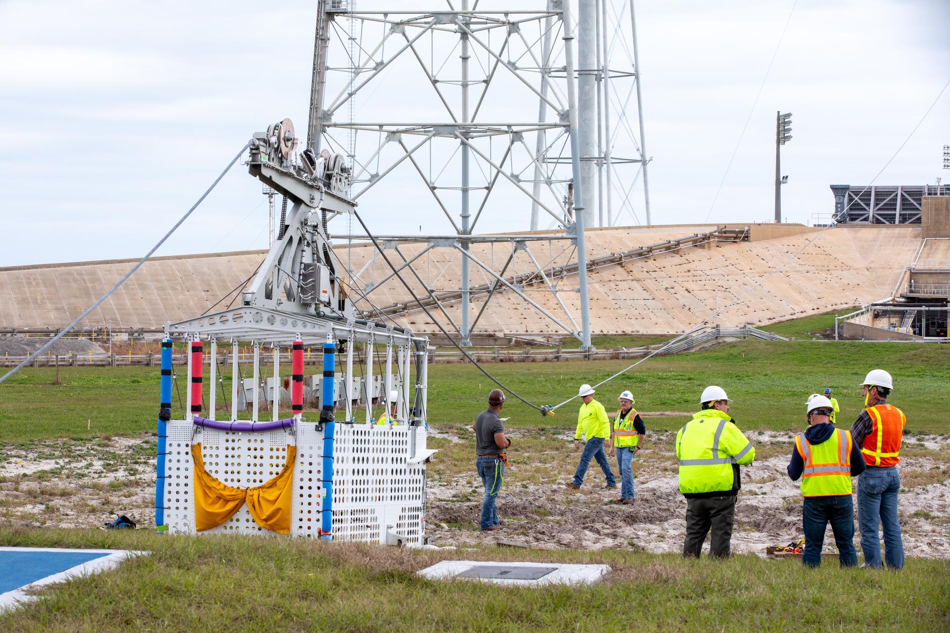 Teams with NASA’s Exploration Ground Systems Program, in preparation for the agency’s Artemis II crewed mission to the Moon, begin installation of four emergency egress baskets at Launch Complex 39B at Kennedy Space Center in Florida on Thursday, Jan. 18, 2024. The baskets, similar to gondolas on ski lifts, are used in the case of a pad abort emergency to enable astronauts and other pad personnel a way to quickly escape away from the mobile launcher to the base of the pad and where waiting emergency transport vehicles will then drive them away.