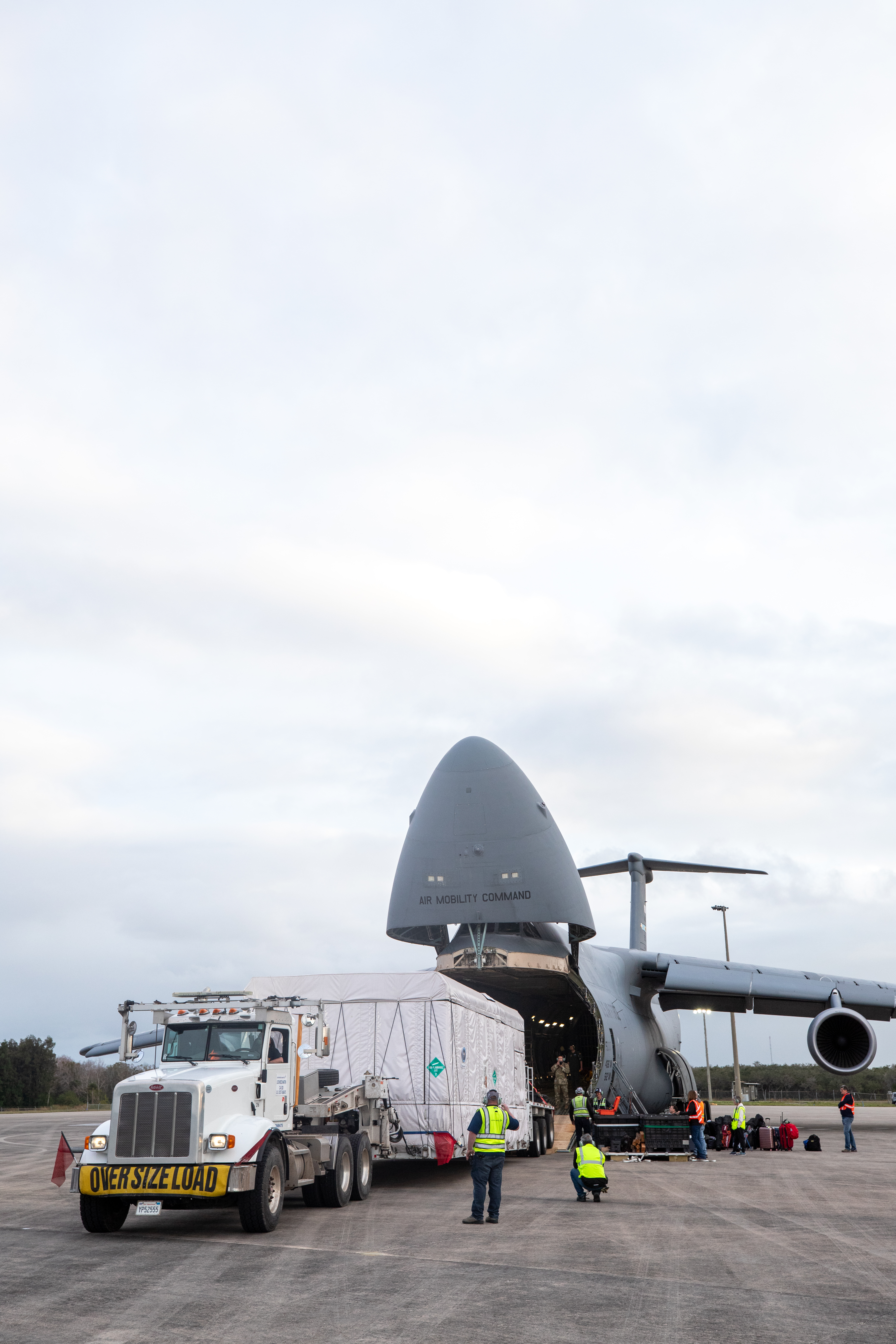NOAA’s Geostationary Operational Environmental Satellite-U (GOES-U) is offloaded from a C-5M Super Galaxy transport aircraft onto the flatbed of a heavy-lift truck at the Launch and Landing Facility at NASA’s Kennedy Space Center in Florida on Tuesday, Jan. 23, 2024. Crews transported the satellite to the Astrotech Space Operations facility in Titusville, Florida to prepare it for launch. Part of a collaborative NOAA and NASA program, GOES-U is the fourth in a series of four advanced geostationary weather satellites. Data from the GOES satellite constellation – consisting of the GOES-R, GOES-S, GOES-T and GOES-U spacecraft – enables forecasters to predict, observe, and track local weather events that affect public safety like thunderstorms, hurricanes, and wildfires.