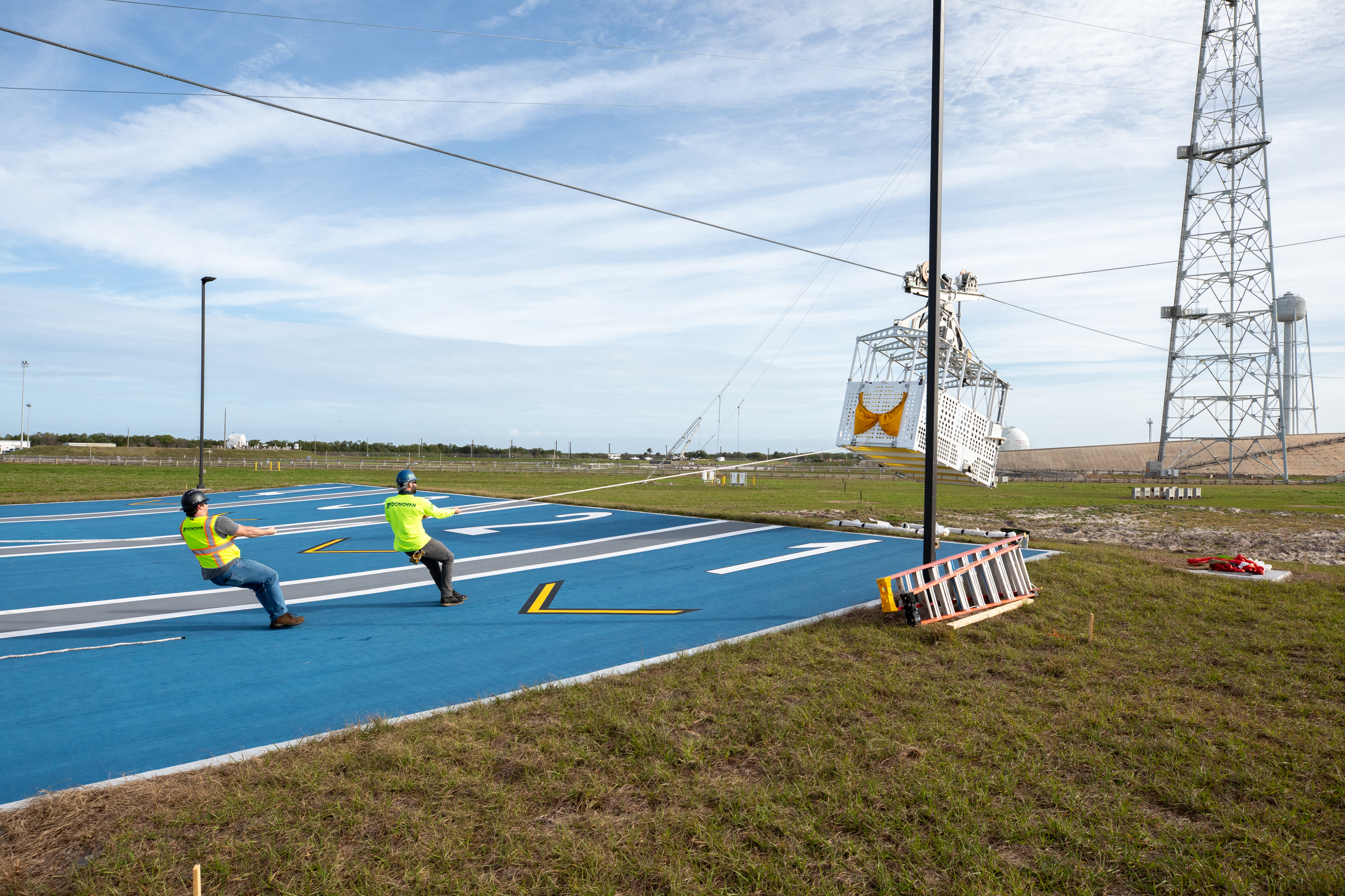 Teams with NASA’s Exploration Ground Systems Program, in preparation for the agency’s Artemis II crewed mission to the Moon, begin installing the first of four emergency egress baskets on the mobile launcher at Launch Complex 39B at the agency’s Kennedy Space Center in Florida on Wednesday, Jan. 24, 2024. The baskets, similar to gondolas on ski lifts, are used in the case of a pad abort emergency to enable astronauts and other pad personnel a way to quickly escape away from the mobile launcher to the base of the pad and where waiting emergency transport vehicles will then drive them away.