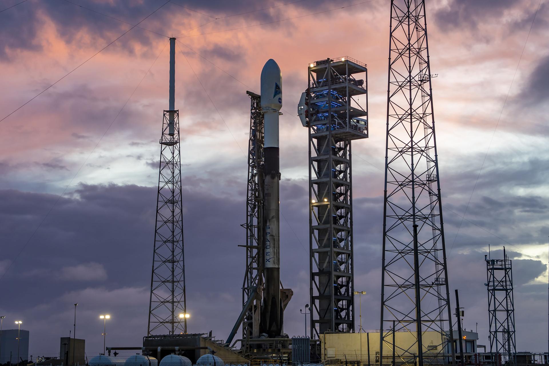 A SpaceX Falcon 9 rocket with NASA’s PACE (Plankton, Aerosol, Cloud, ocean Ecosystem) spacecraft stands vertical at Space Launch Complex 40 at Cape Canaveral Space Force Station in Florida on Monday, Feb. 5, 2024. PACE is NASA’s newest earth-observing satellite that will help increase our understanding of Earth’s oceans, atmosphere, and climate by delivering hyperspectral observations of microscopic marine organisms called phytoplankton as well new data on clouds and aerosols. Liftoff of the PACE mission is set for no earlier than 1:33 a.m. EST on Wednesday, Feb. 7, 2024.