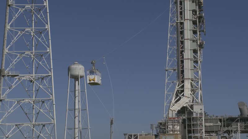 Teams with Exploration Ground Systems Program are starting to install the emergency egress baskets on the mobile launcher at Launch Pad 39B in preparation for future crewed Artemis missions starting with Artemis II.