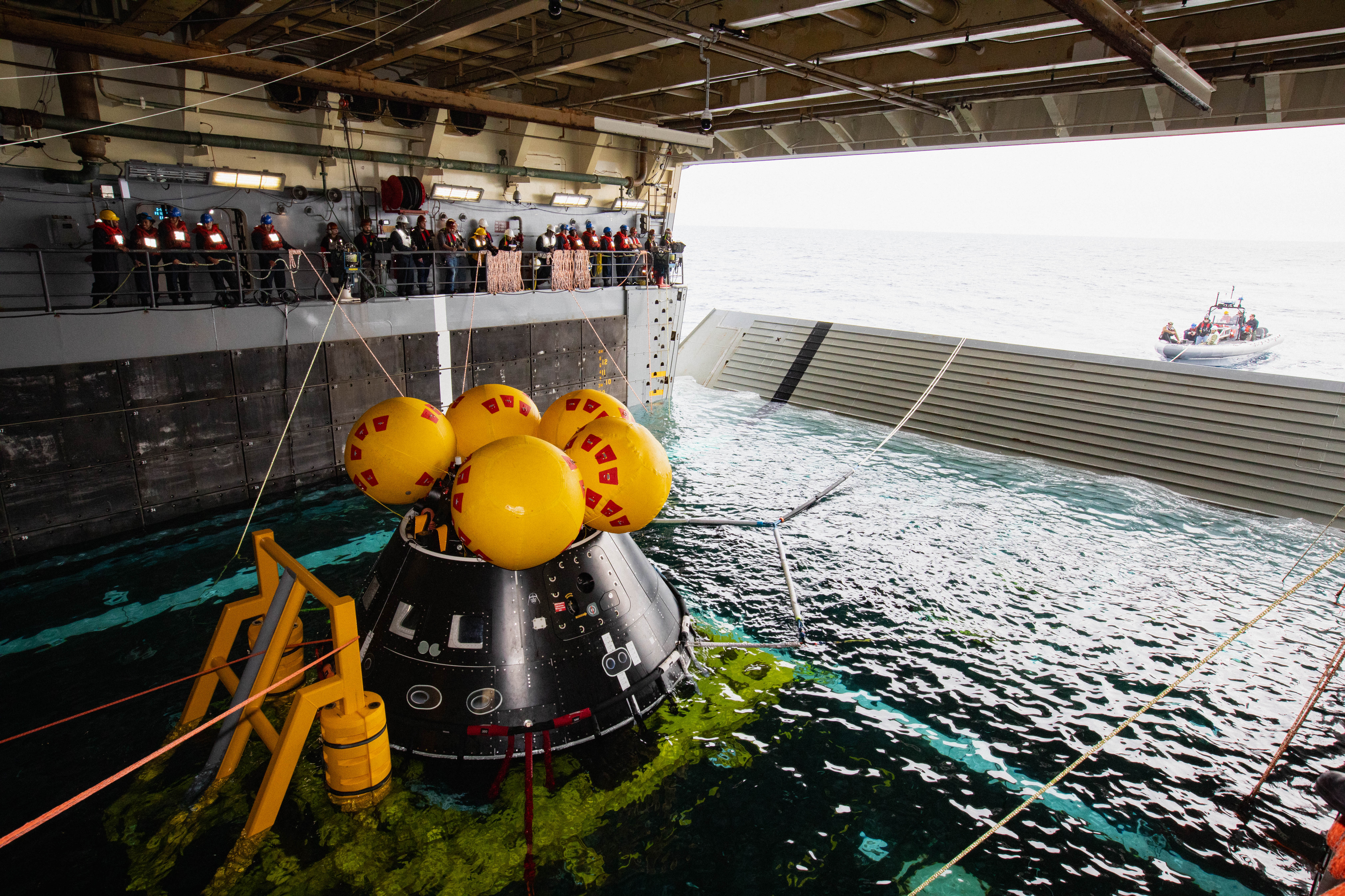 NASA’s Exploration Ground System’s Landing and Recovery team and partners from the Department of Defense aboard the USS San Diego practice recovery procedures using the Crew Module Test Article, during Underway Recovery Test 11 (URT-11) off the coast of San Diego, California on Sunday, Feb. 25, 2024. URT-11 is the eleventh in a series of Artemis recovery tests, and the first time NASA and its partners put their Artemis II recovery procedures to the test with the astronauts.