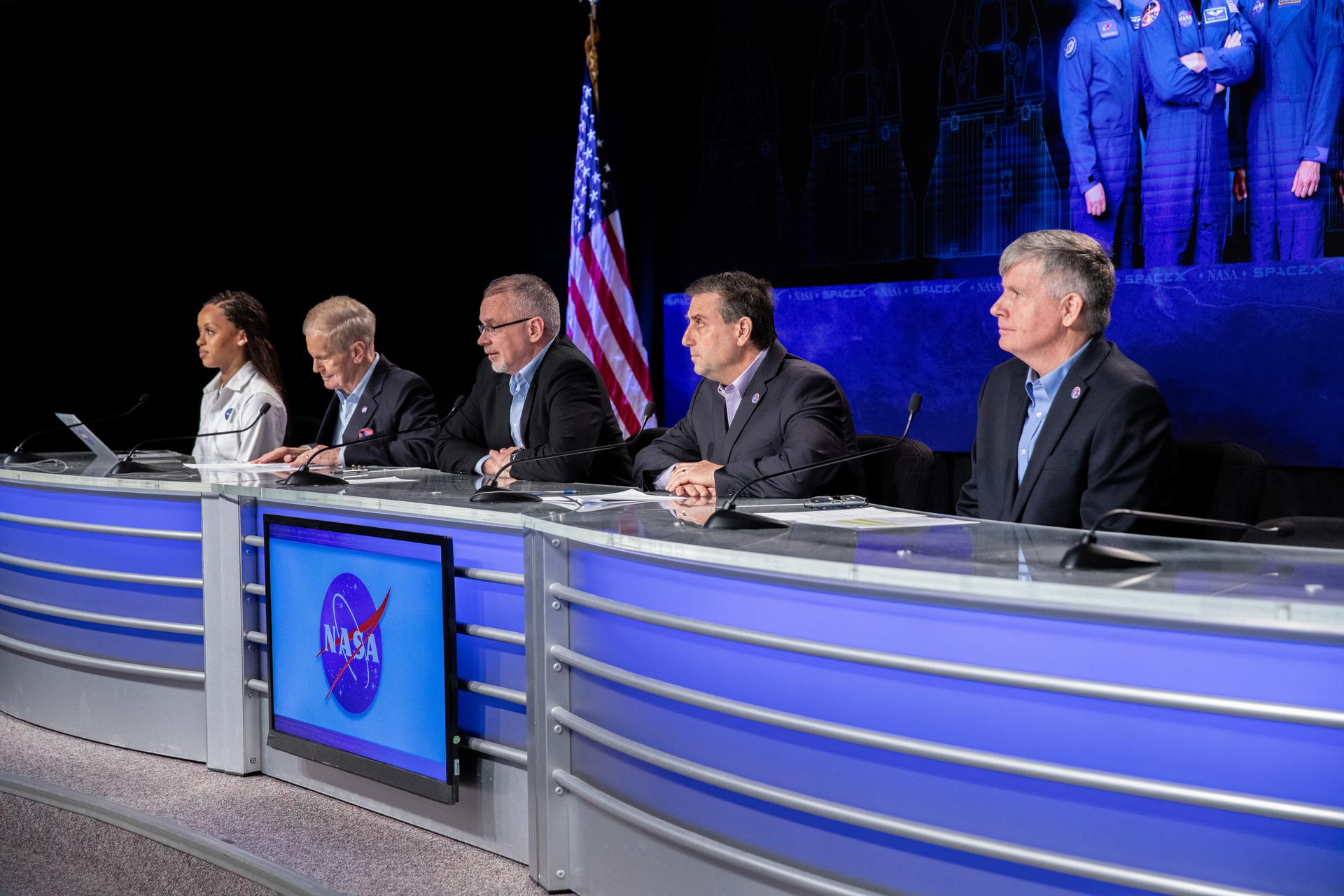 Officials from NASA participate in the NASA Administrator Media Briefing inside the John Holliman Auditorium of the News Center at NASA’s Kennedy Space Center in Florida on Wednesday, Feb. 28, 2024, ahead of NASA’s SpaceX Crew-8 mission to the International Space Station. The launch is targeted for 12:04 a.m. EST, Friday, March 1, from Launch Complex 39A at Kennedy. From left to right are NASA Press Secretary Faith McKie, NASA Administrator Bill Nelson, NASA Associate Administrator Jim Free, International Space Station Program Manager Joel Montalbano, and Commercial Crew Program Manager Steve Stich.