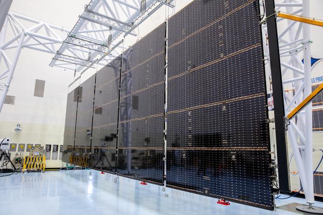 The first of two five-panel solar arrays built for NASA’s Europa Clipper is fully extended from a shipping configuration and suspended on a support system called a gravity offload fixture to begin inspection and cleaning as part of assembly, test, and launch operations inside the Payload Hazardous Servicing Facility at the agency’s Kennedy Space Center in Florida on Wednesday, March 6, 2024. Another name for the gravity offload fixture is the Transportable Large Envelope Deployment Facility (T-LEDF). When both solar arrays are installed and deployed on Europa Clipper – the agency’s largest spacecraft ever developed for a planetary mission – the spacecraft will span a total length of more than 100 feet and weigh 7,145 pounds without the inclusion of propellants.