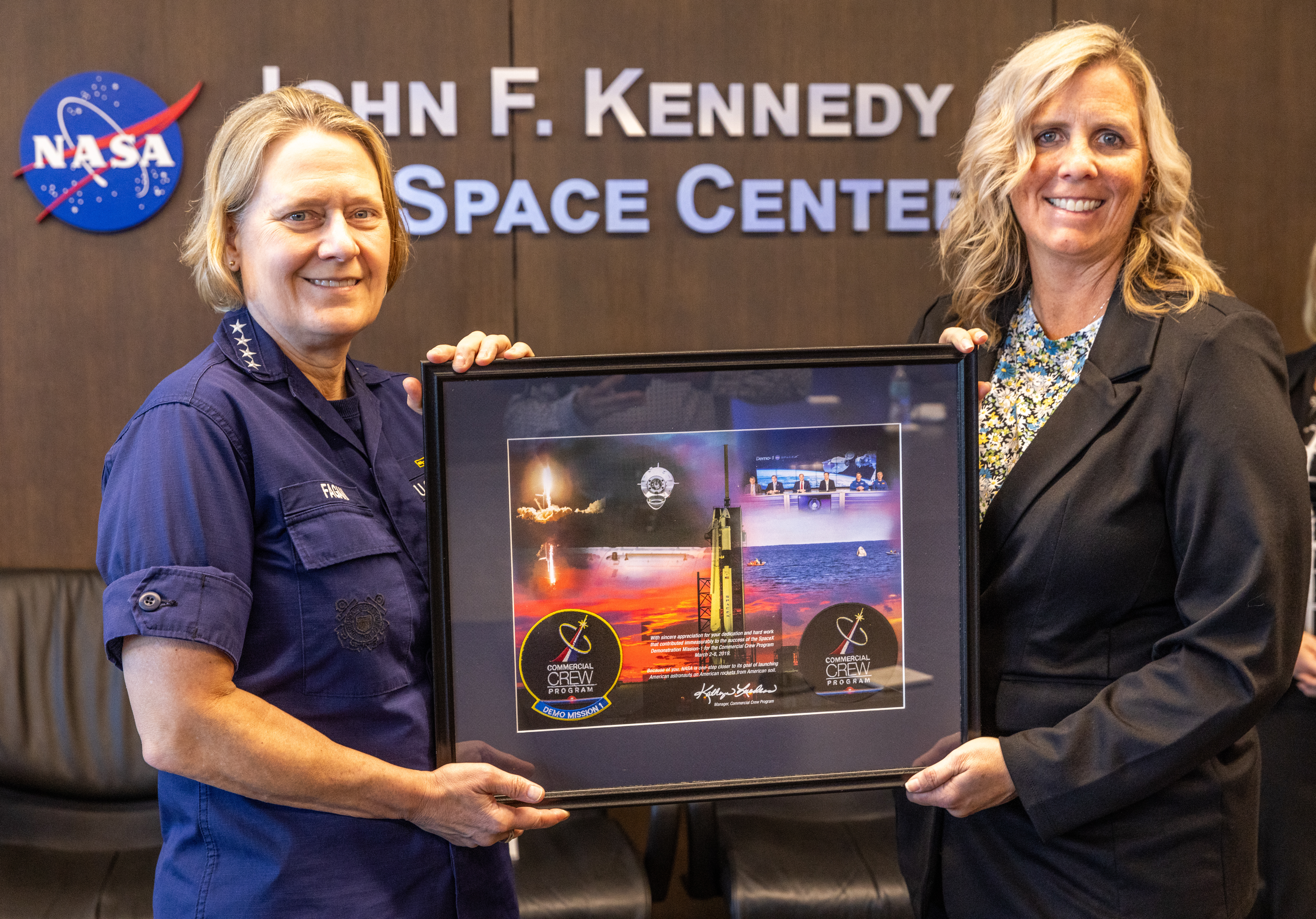 U.S. Coast Guard Admiral Linda Fagan receives NASA’s Silver Group Achievement Award during a ceremony held the headquarters building at NASA’s Kennedy Space Center in Florida on Thursday, March 14, 2024. The Silver Group Achievement Award recognizes the commitment of the U.S. Coast Guard Sector Jacksonville in providing splashdown and recovery support for the safe return of crew and cargo space capsules.