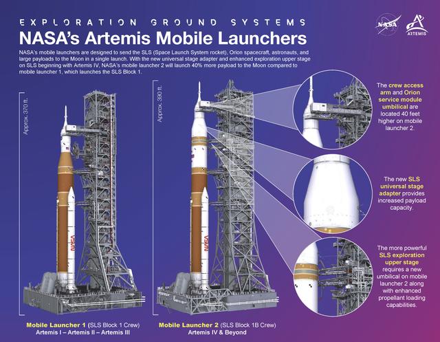 This infographic explains NASA’s mobile launchers designed for the agency's Artemis missions to send the Space Launch System rocket, Orion spacecraft, and large payloads to the Moon in a single launch.