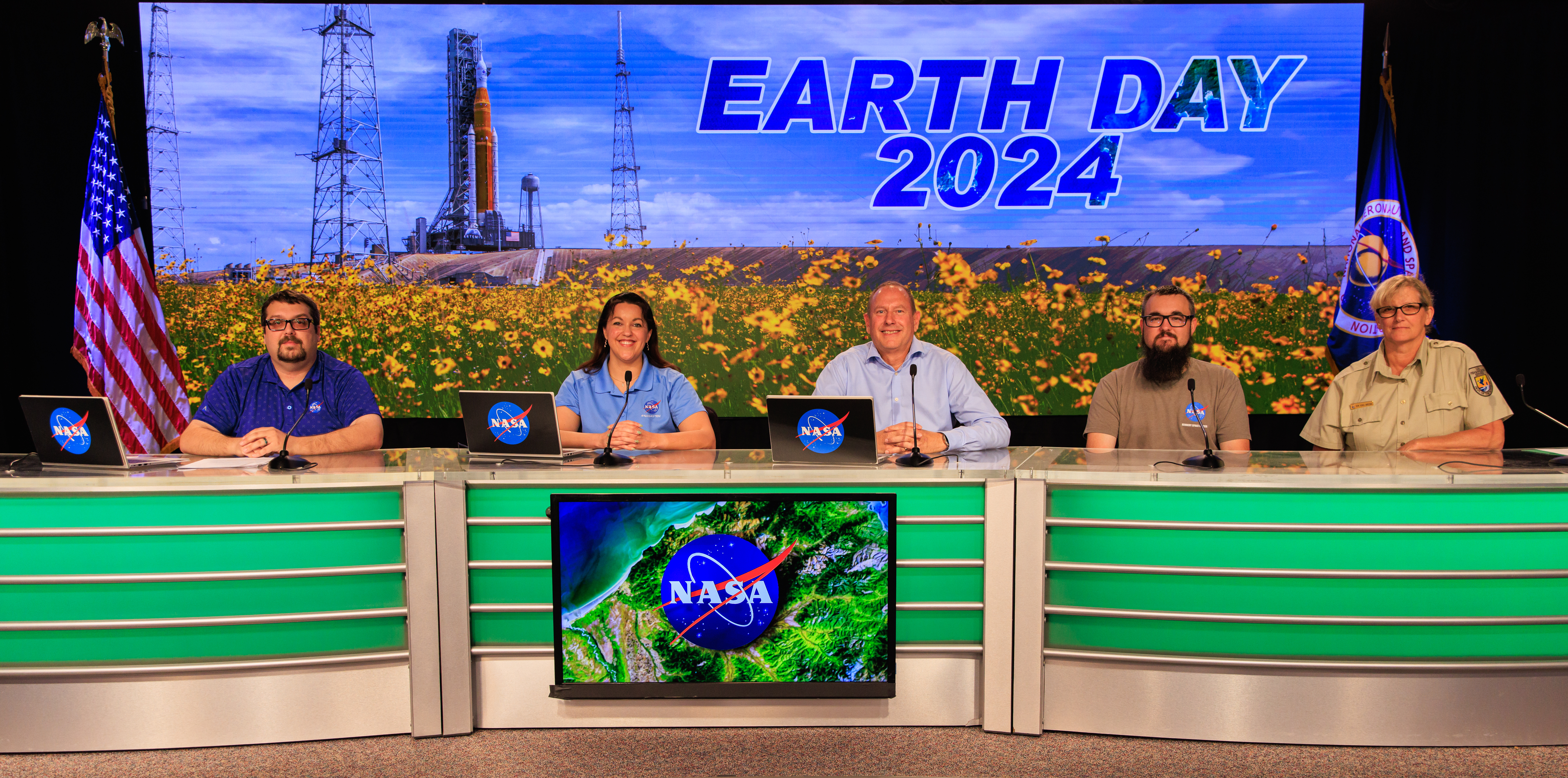 As part of NASA’s NextGen STEM project, the agency hosted an environmentally focused Earth Day briefing on Tuesday, April 2, 2024, inside NASA News Center’s John Holliman Auditorium at the agency’s Kennedy Space Center. Participants from left to right include, Messod Bendayan, NASA Communications; Kelly McCarthy, NASA’s Office of STEM Engagement, Bob Kline, Kennedy’s Environmental Assurance Branch; Spencer Davis, Kennedy’s Exploration Ground Systems; and Kim King-Wrenn, Merritt Island National Wildlife Refuge.