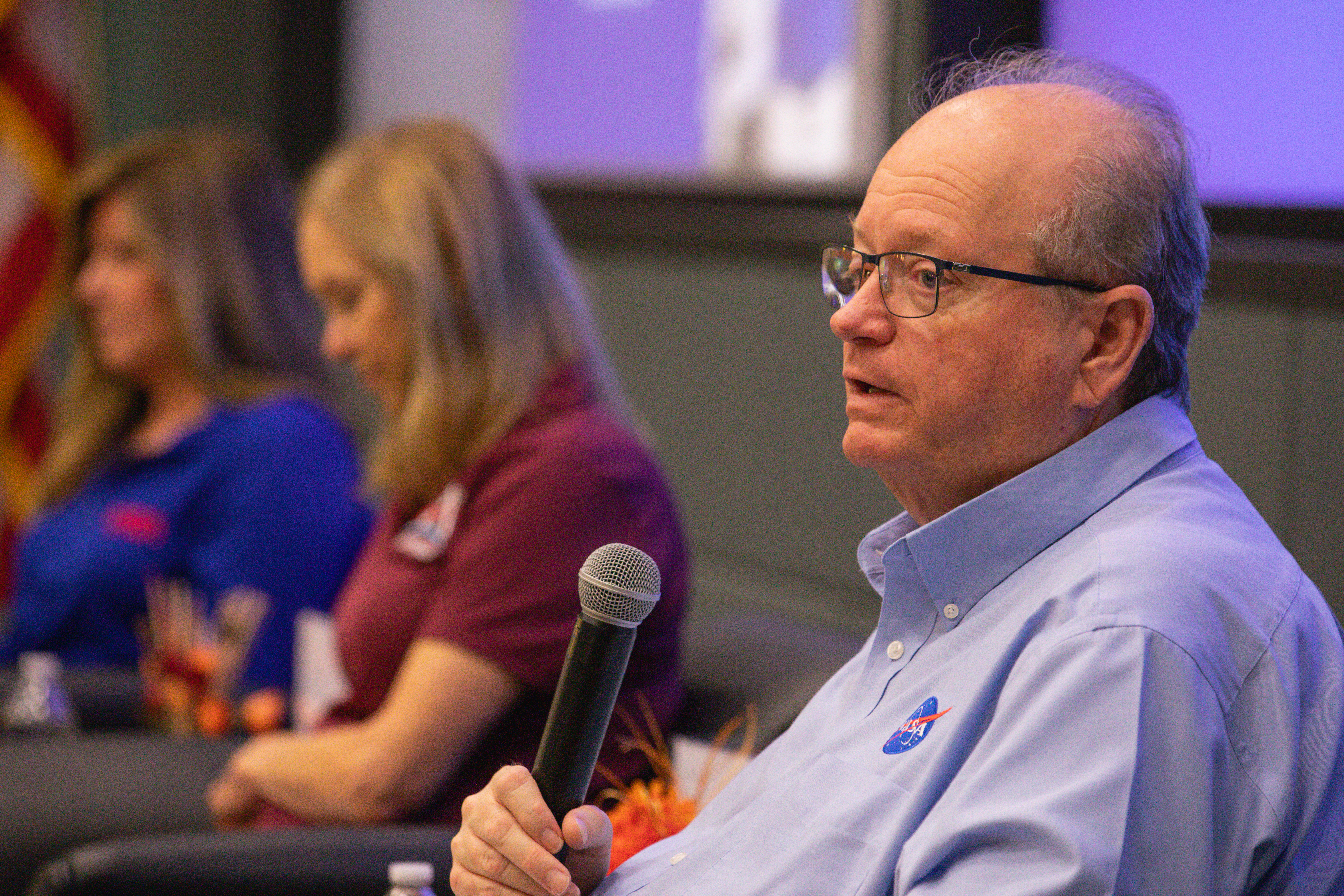 From left, Jennifer Kunz, associate director, technical; Janet Petro, center director; and Burt Summerfield, associate director, management, at NASA’s Kennedy Space Center in Florida participate in an employee town hall meeting held on Thursday, May 9, 2024, at Kennedy’s Operations Support Building II. Center leadership provided the workforce a center update, safety presentation, and answered employee questions during the town hall.