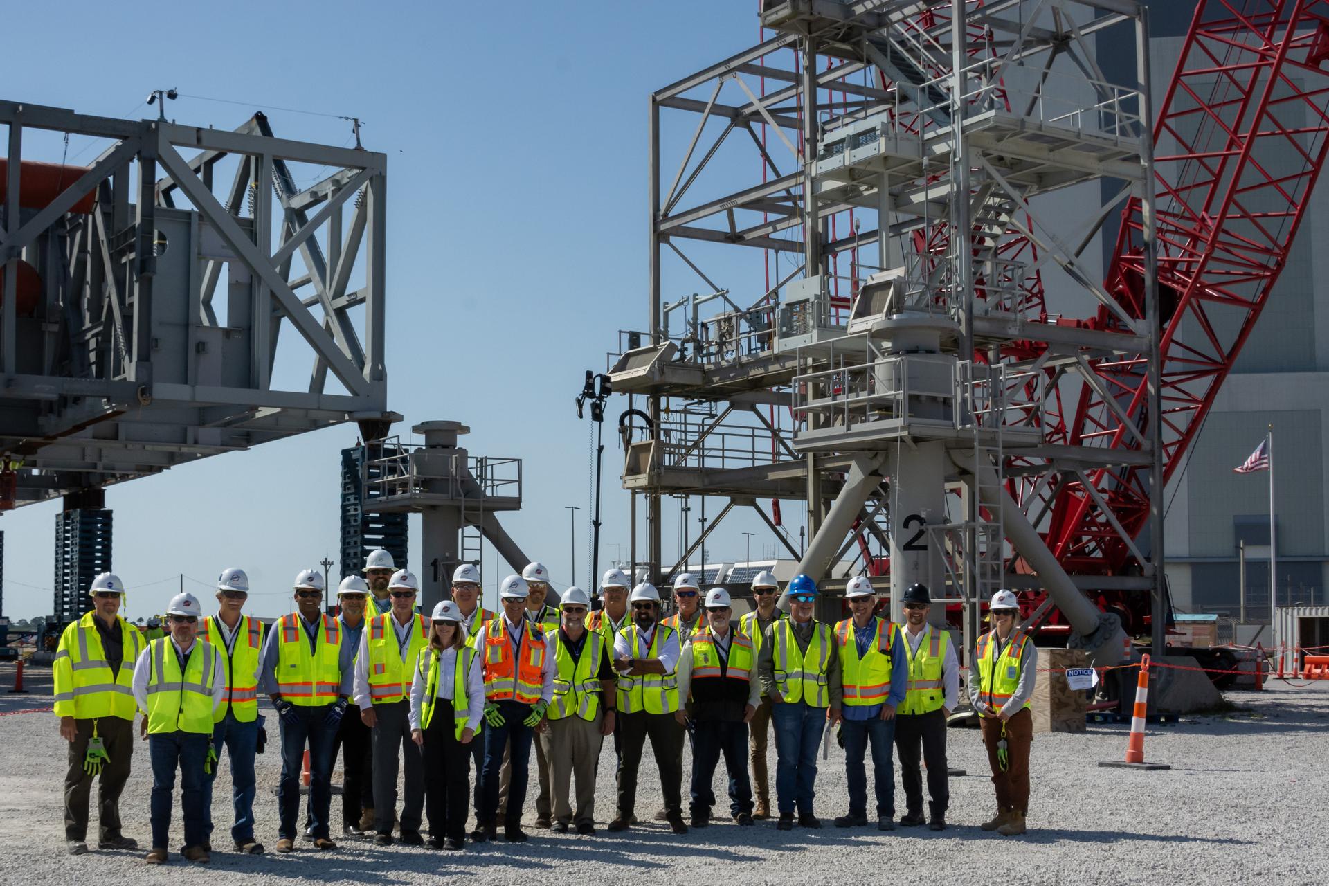 Teams with NASA’s Exploration Ground Systems Program and primary contractor, Bechtel National, Inc., pose for a photo near construction of a permanent mount structure where they will continue building the agency’s new mobile launcher 2 at Kennedy Space Center in Florida on Thursday, May 9, 2024. The 355-foot-tall mobile launcher 2 with a two-story base and a tower will be used to assemble and process the SLS (Space Launch System) rocket and Orion spacecraft in the Vehicle Assembly Building on NASA’s upcoming Artemis missions to the Moon beginning with Artemis IV.