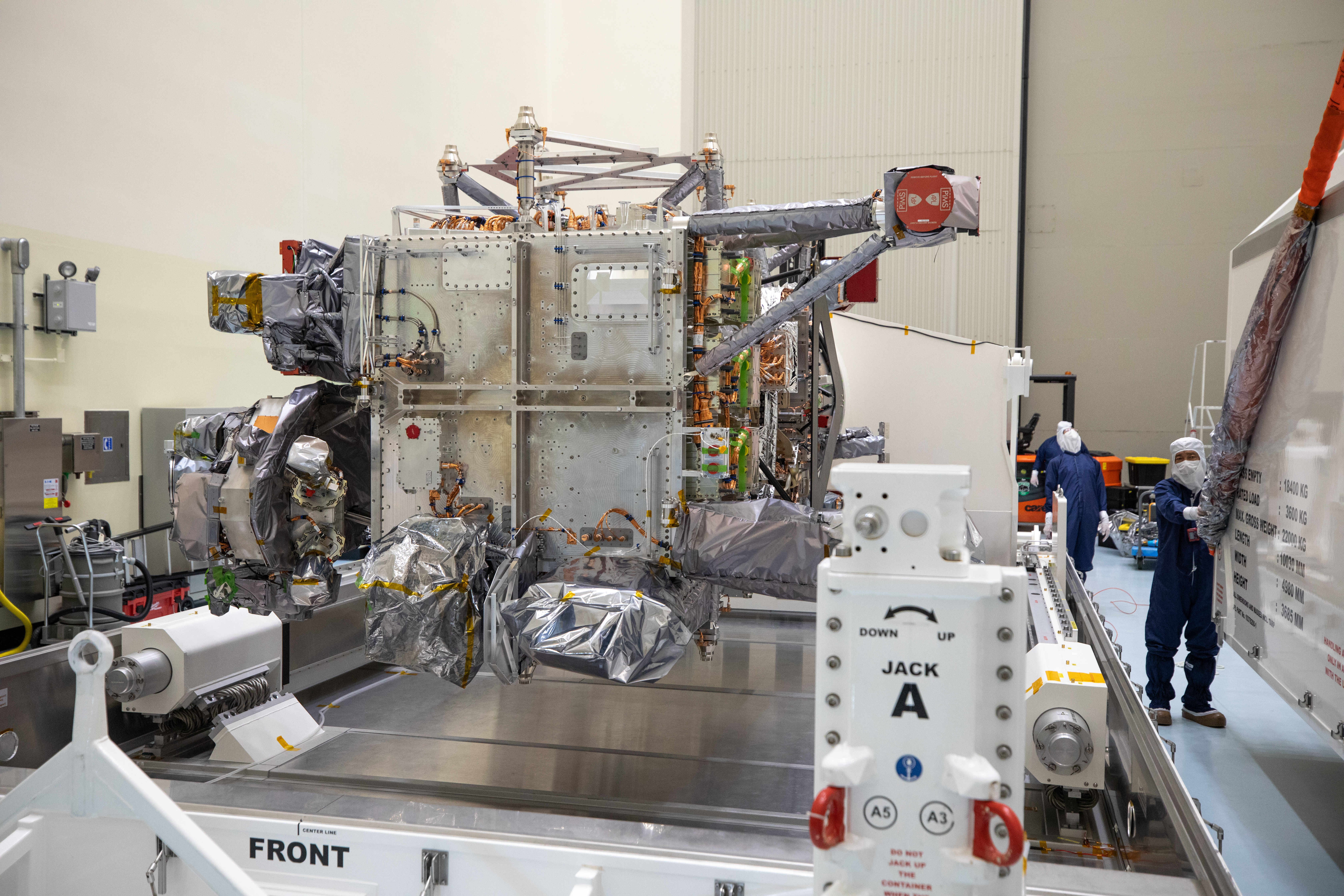 As part of prelaunch processing, crews inside the Payload Hazardous Servicing Facility at NASA’s Kennedy Space Center in Florida uncrate the agency’s largest planetary mission spacecraft, Europa Clipper, on Tuesday, May 28, 2024. Slated to launch aboard a SpaceX Falcon Heavy rocket later this year from Launch Complex 39A at Kennedy, Europa Clipper will help determine if conditions exist below the surface Jupiter’s fourth largest moon, Europa, that could support life.