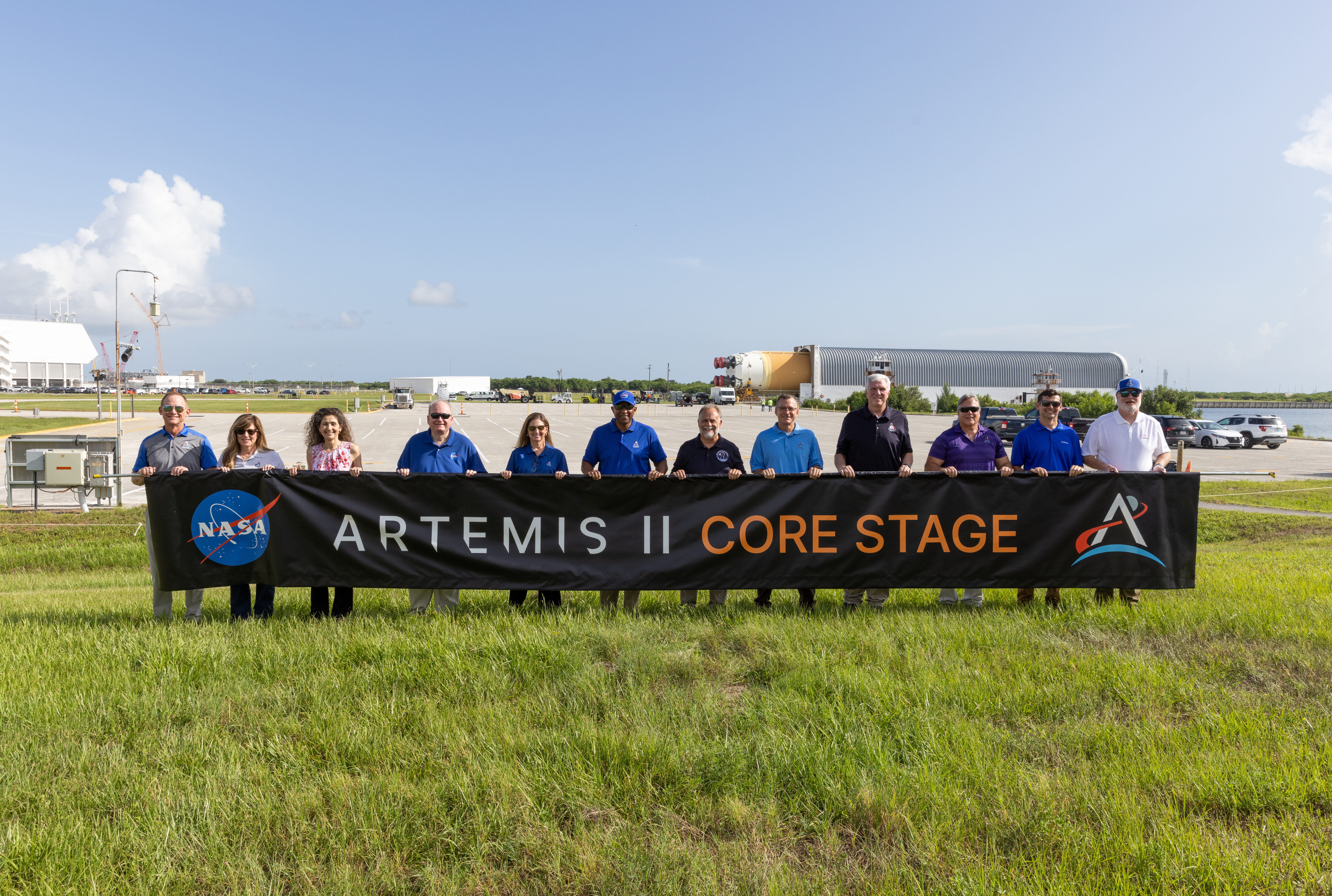 From left, John Ramsey, chief transformation officer for Jacobs; Jennifer Kunz, associate director, technical, NASA’s Kennedy Space Center; Lorna Kenna, vice president and general manager, Jacobs; Burt Summerfield, associate director, management, NASA Kennedy; Catherine Koerner, associate administrator for NASA’s Exploration Systems Development Mission Directorate; Kelvin Manning, deputy director, NASA Kennedy; Shawn Quinn, manager, NASA’s Exploration Ground Systems; Cliff Lanham, senior vehicle operations manager, NASA’s Exploration Ground Systems; Matthew Ramsey, Artemis II mission manager; Paul Hudson, Jacobs senior vehicle engineer; Jay Grow, Boeing’s associate chief engineer for Space Launch System Launch Operations; and Bill Muddle, lead RS-25 field engineer at Aerojet Rocketdyne, hold a banner to celebrate the arrival of the Artemis II SLS (Space Launch System) core stage at NASA’s Kennedy Space Center on Wednesday, July 24, 2024. Journeying from NASA’s Michoud Assembly Facility in New Orleans aboard the Pegasus barge, the core stage arrived at the Florida spaceport on July 23, 2024, to be processed for flight by NASA’s Exploration Ground Systems Program.