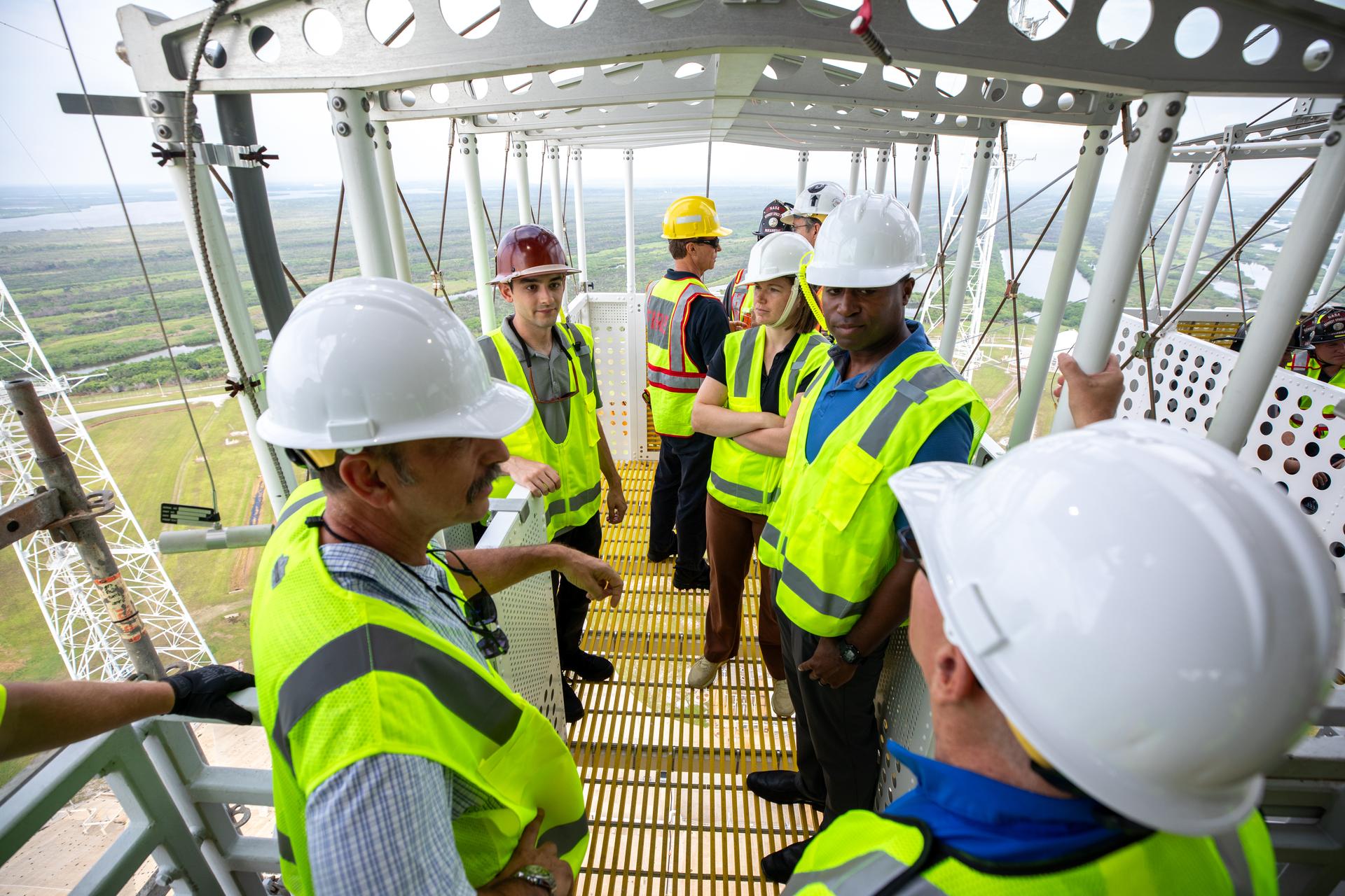 Teams with NASA’s Exploration Ground Systems Program, as well as NASA’s pad rescue team, conduct training inside the Artemis emergency egress baskets at Launch Pad 39B as part of the Artemis emergency egress demonstration training at the agency’s Kennedy Space Center in Florida on Thursday, Aug. 8, 2024. The baskets, similar to gondolas on ski lifts, are used in the case of a pad abort emergency to enable astronauts and other pad personnel a way to quickly escape away from the mobile launcher to the base of the pad and where waiting emergency transport vehicles will then drive them away.