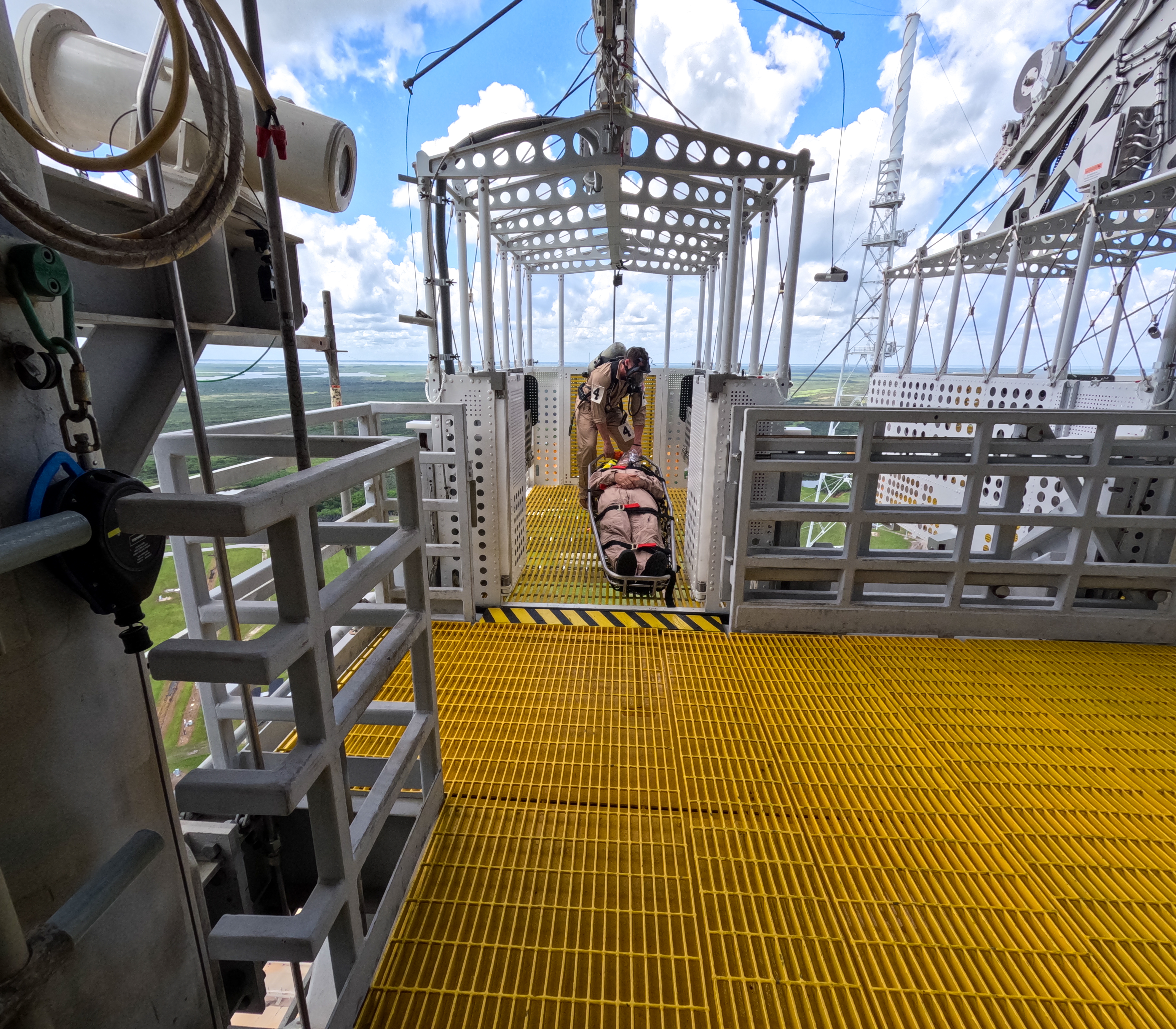Teams at NASA’s Kennedy Space Center in Florida practice the Artemis mission emergency escape or egress procedures during a series of integrated system verification and validation tests at Launch Pad 39B on Sunday, Aug. 11, 2024. Members of the closeout crew, pad rescue team and the Exploration Ground Systems Program practiced the process of getting inside and out of the emergency egress baskets. While the crew and other personnel will ride the emergency egress baskets to the terminus area in a real emergency, no one rode the baskets for this test. Instead, teams tested the baskets during separate occasions by using water tanks filled to different levels to replicate simulate the weight of passengers.