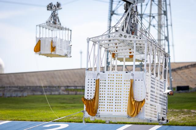 Teams at NASA’s Kennedy Space Center in Florida practice the Artemis mission emergency escape or egress procedures during a series of integrated system verification and validation tests at Launch Pad 39B on Monday, Aug. 12, 2024. Members of the closeout crew, pad rescue team and the Exploration Ground Systems Program practiced the process of getting inside and out of the emergency egress baskets. While the crew and other personnel will ride the emergency egress baskets to the terminus area in a real emergency, no one rode the baskets for this test. Instead, teams tested the baskets during separate occasions by using water tanks filled to different levels to replicate simulate the weight of passengers.