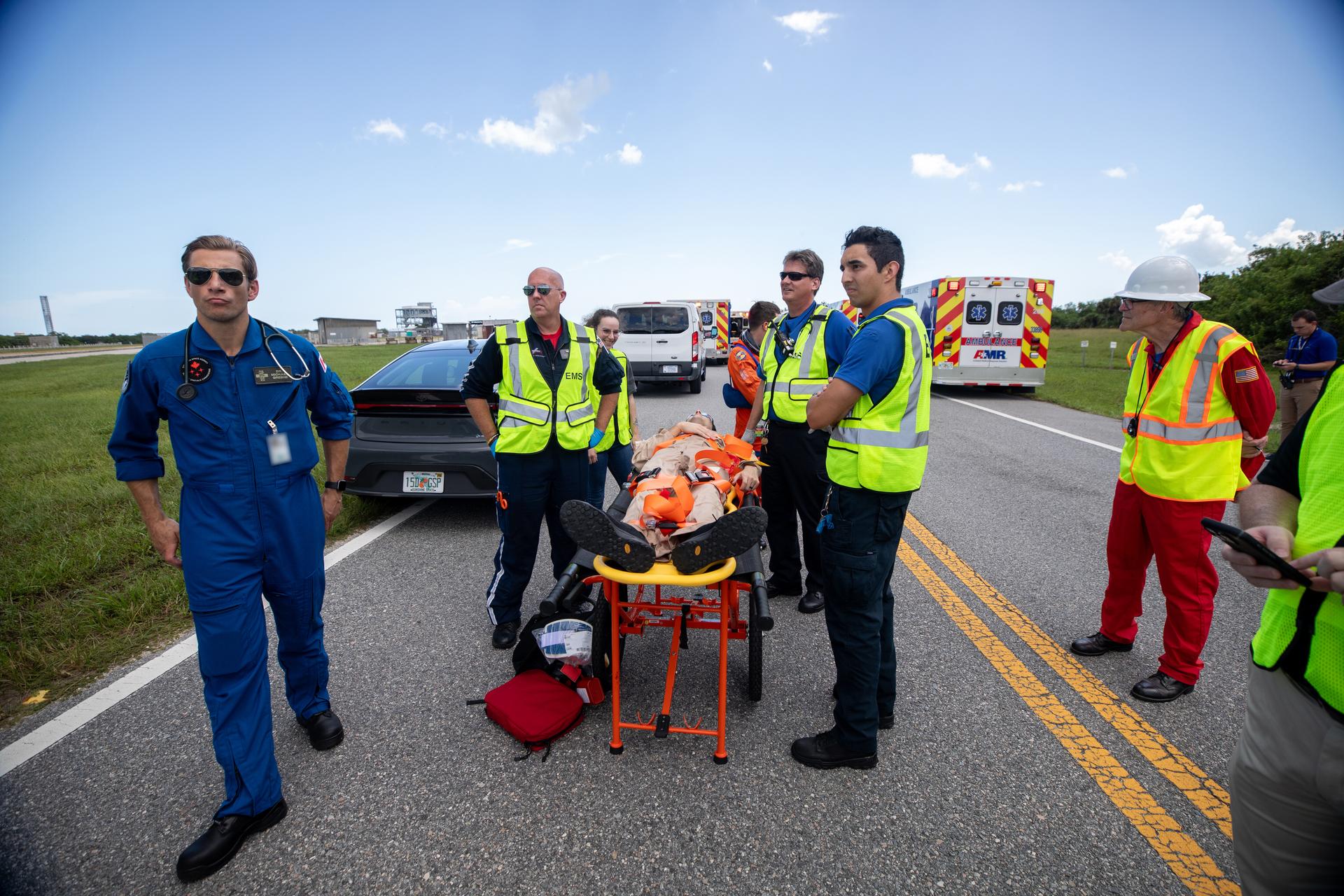 Medical, fire-rescue personnel, and simulated flight crew members participate in the Artemis II mission emergency escape or egress verification and validation tests near Launch Complex 39 at NASA's Kennedy Space Center in Florida on Monday, Aug. 12, 2024. During the multi-day tests, members of the closeout crew, pad rescue team, and the Exploration Ground Systems Program practiced the process of getting in and out of the emergency egress baskets then down to the launch pad where they would be transported to emergency transport vehicles and driven to safety. Prior to this test and throughout the course of several months, teams conducted basket release demonstrations to validate the system.