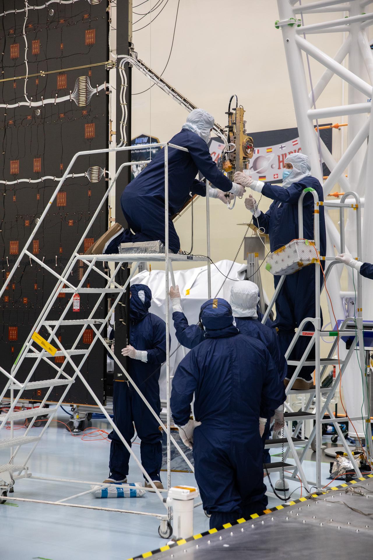Technicians install and align the second set of solar arrays for NASA’s Europa Clipper spacecraft inside the agency’s Payload Hazardous Servicing Facility at Kennedy Space Center in Florida on Thursday, Aug. 15, 2024. The Europa Clipper spacecraft will need the 46.5 feet (14.2 meter) long, five-panel solar arrays on each side, to gather enough sunlight to power the spacecraft to perform flybys around Jupiter’s icy moon, Europa, so science instruments aboard the spacecraft can determine if the moon could hold the building blocks necessary to sustain life.