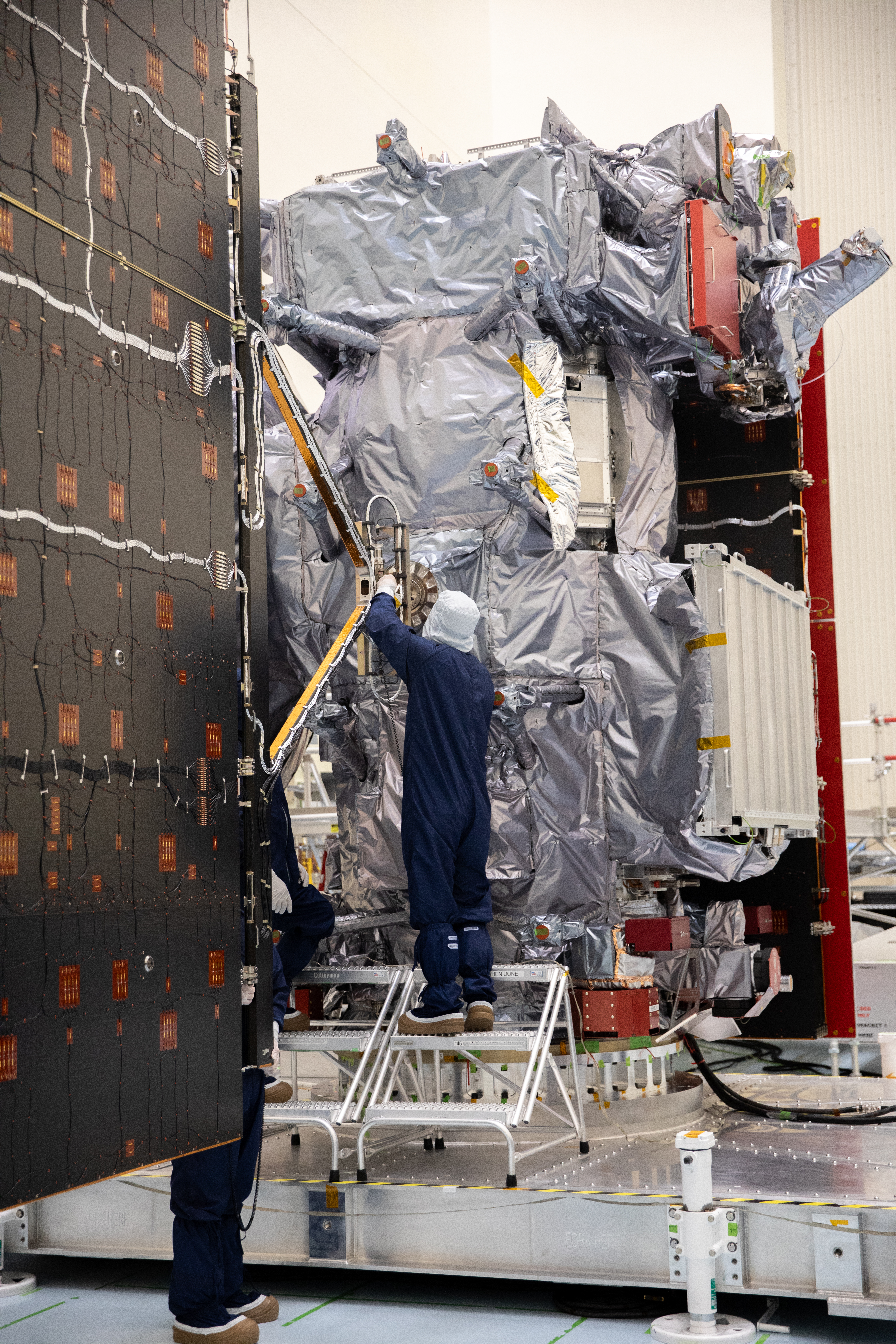 Technicians install and align the second set of solar arrays for NASA’s Europa Clipper spacecraft inside the agency’s Payload Hazardous Servicing Facility at Kennedy Space Center in Florida on Thursday, Aug. 15, 2024. The Europa Clipper spacecraft will need the 46.5 feet (14.2 meter) long, five-panel solar arrays on each side, to gather enough sunlight to power the spacecraft to perform flybys around Jupiter’s icy moon, Europa, so science instruments aboard the spacecraft can determine if the moon could hold the building blocks necessary to sustain life.