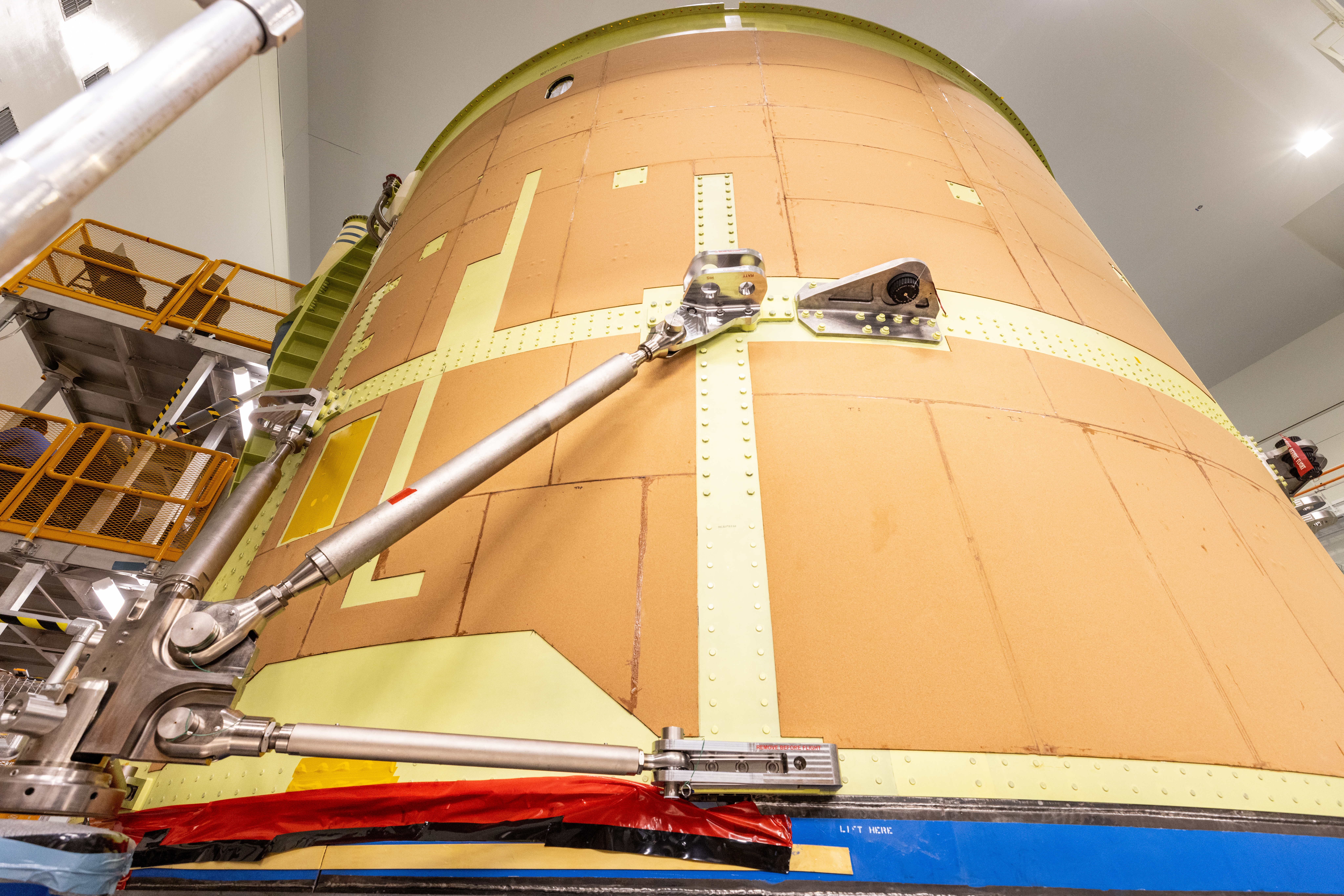 Teams at NASA’s Kennedy Space Center in Florida installed four “quad pods” around the Artemis III core stage engine section inside the spaceport’s Space Systems Processing Facility on Tuesday, Sept. 10, 2024. These structures are used to support the engine assembly during operations. The engine section will be transferred to the NASA Kennedy’s Vehicle Assembly Building for final integration.