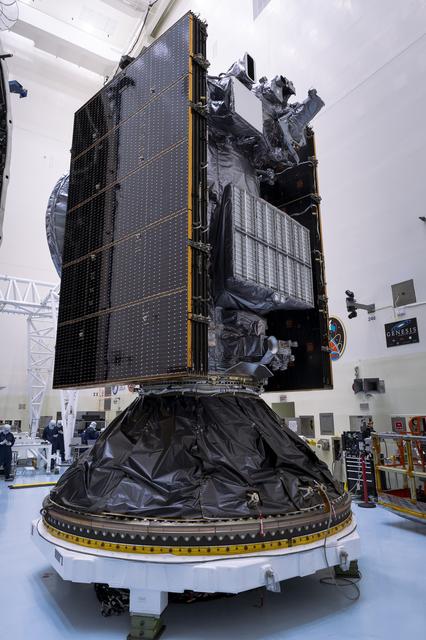 Technicians prepare to encapsulate NASA’s Europa Clipper spacecraft inside SpaceX’s Falcon Heavy payload fairing in the Payload Hazardous Servicing Facility at NASA’s Kennedy Space Center in Florida on Wednesday, Oct. 2, 2024. The payload fairing will protect the spacecraft during liftoff from Launch Complex 39A on its journey to explore Jupiter’s icy moon, Europa. The spacecraft will complete nearly 50 flybys of Jupiter’s icy moon, Europa, to determine if there are conditions suitable for life beyond Earth.