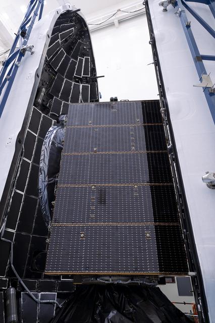 Technicians prepare to encapsulate NASA’s Europa Clipper spacecraft inside SpaceX’s Falcon Heavy payload fairing in the Payload Hazardous Servicing Facility at NASA’s Kennedy Space Center in Florida on Wednesday, Oct. 2, 2024. The payload fairing will protect the spacecraft during liftoff from Launch Complex 39A on its journey to explore Jupiter’s icy moon, Europa. The spacecraft will complete nearly 50 flybys of Jupiter’s icy moon, Europa, to determine if there are conditions suitable for life beyond Earth.