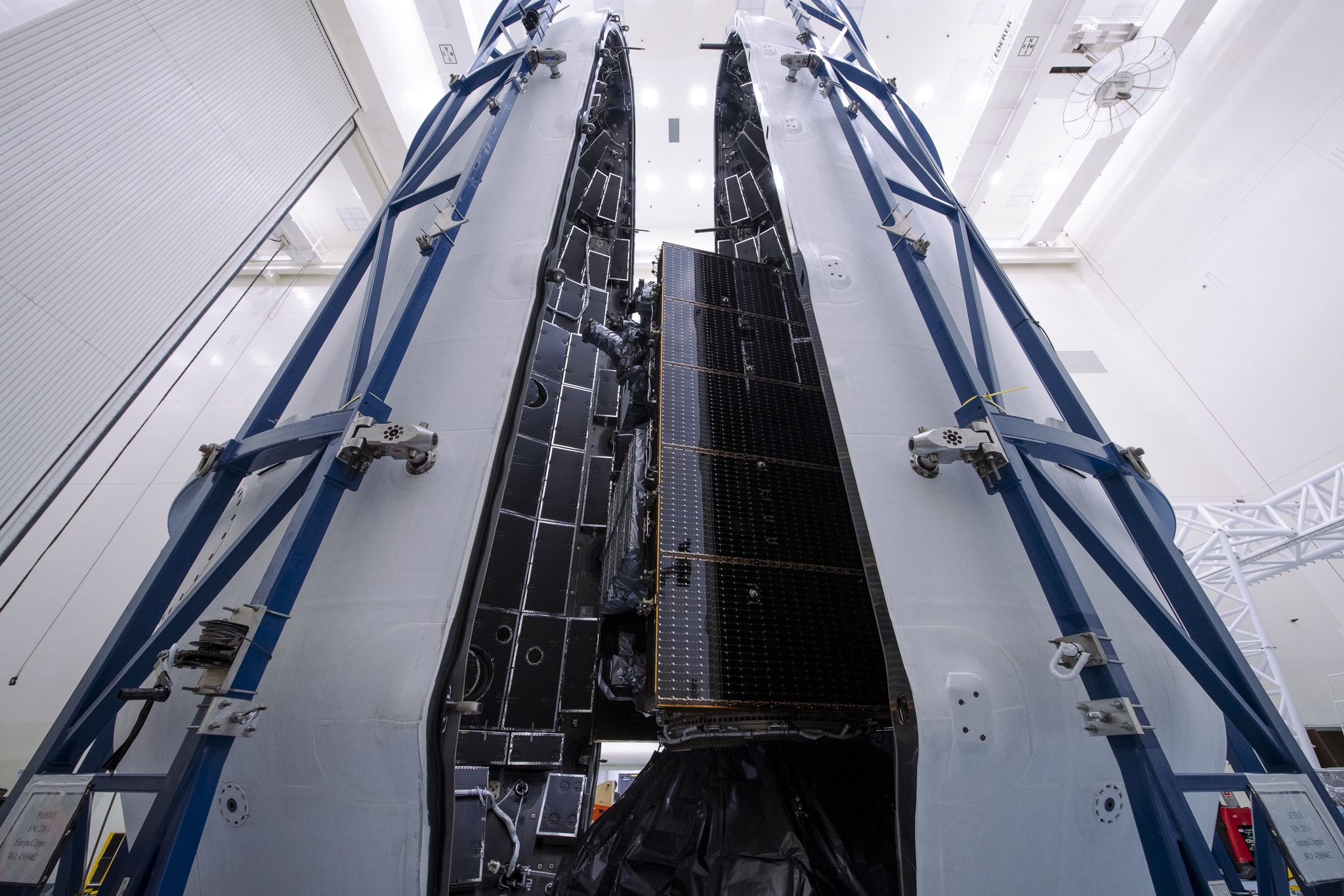 Technicians encapsulate NASA’s Europa Clipper spacecraft inside SpaceX’s Falcon Heavy payload fairing in the Payload Hazardous Servicing Facility at NASA’s Kennedy Space Center in Florida on Wednesday, Oct. 2, 2024. The payload fairing will protect the spacecraft during liftoff from Launch Complex 39A on its journey to explore Jupiter’s icy moon, Europa. The spacecraft will complete nearly 50 flybys of Jupiter’s icy moon, Europa, to determine if there are conditions suitable for life beyond Earth.