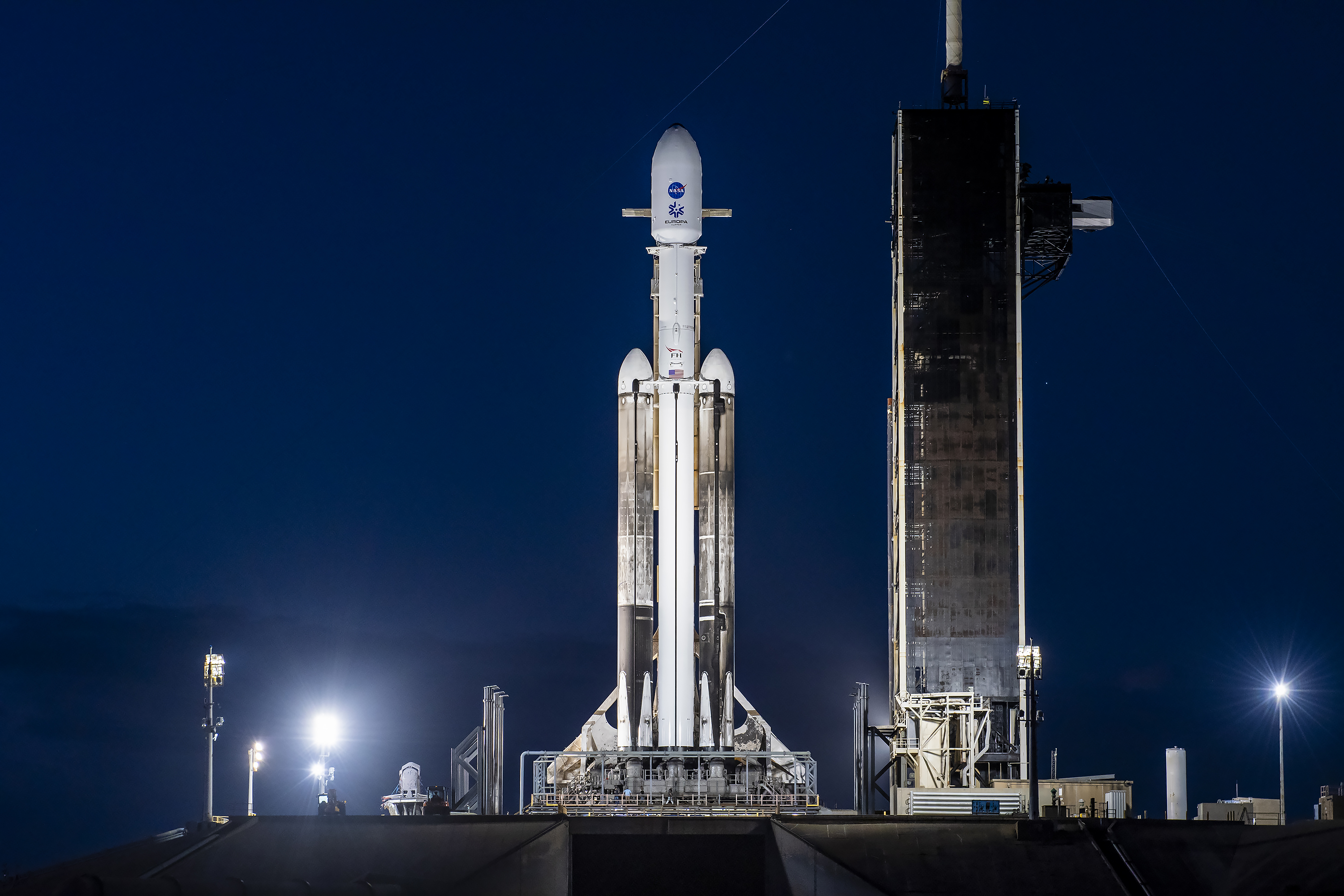 NASA’s Europa Clipper spacecraft and SpaceX’s Falcon Heavy rocket are vertical at Launch Pad 39A on Sunday, Oct. 13, 2024, at the agency’s Kennedy Space Center in Florida ahead of launch to Jupiter’s icy moon, Europa. The spacecraft will complete nearly 50 flybys of Europa to determine if there are conditions suitable for life beyond Earth. Launch is targeting 12:06 p.m. EDT on Monday, Oct. 14, from Launch Complex 39A at Kennedy Space Center in Florida.