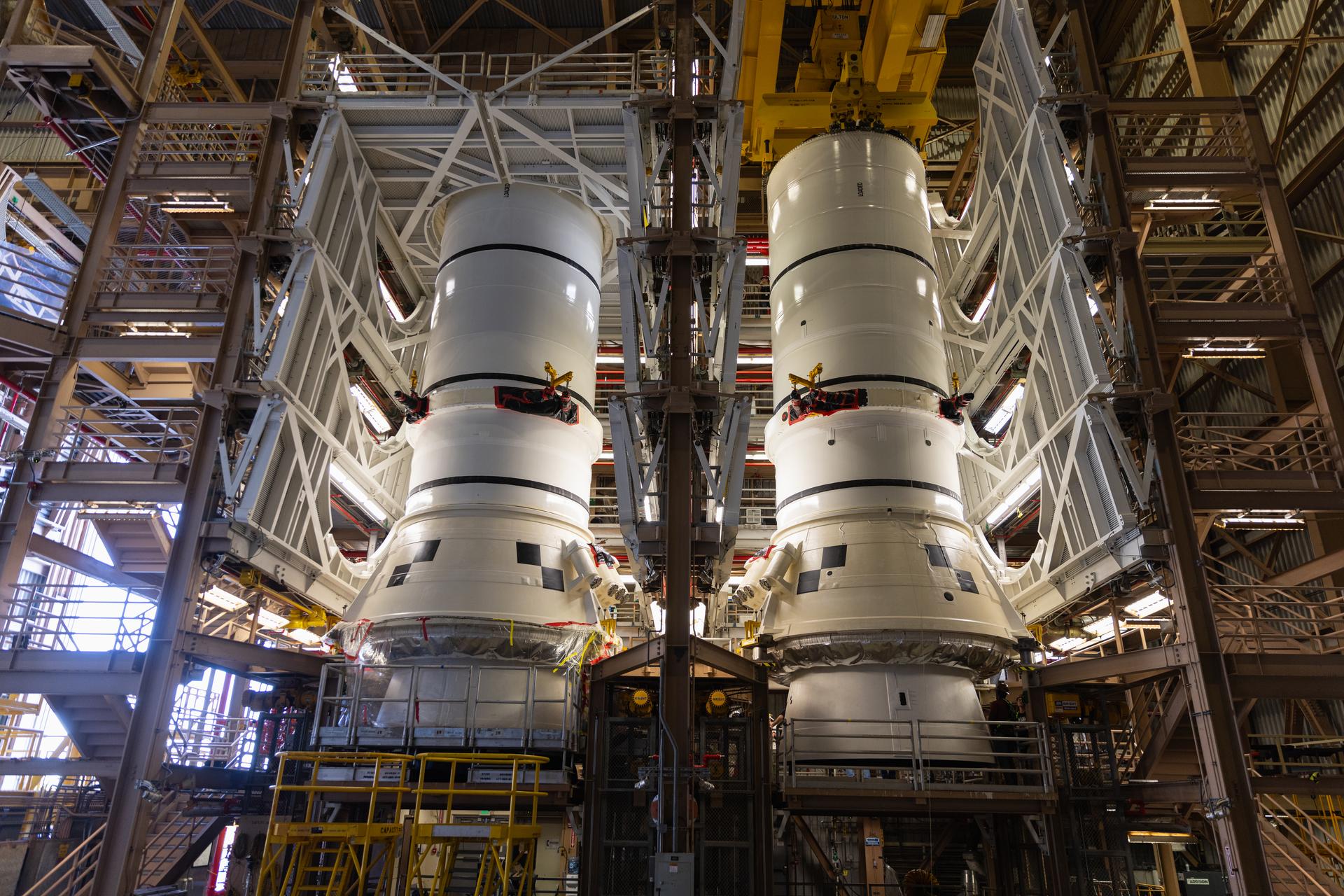 Engineers and technicians with the Exploration Ground Systems Program prepare to move the aft assemblies of the SLS (Space Launch System) solid rocket boosters for the Artemis II mission with an overhead crane inside the Rotation, Processing and Surge Facility at NASA’s Kennedy Space Center in Florida on Wednesday, Nov. 13, 2024. The booster segments are being transferred to the NASA Kennedy’s Vehicle Assembly Building via a transporter for stacking operations in preparation for launch of the Artemis II mission.