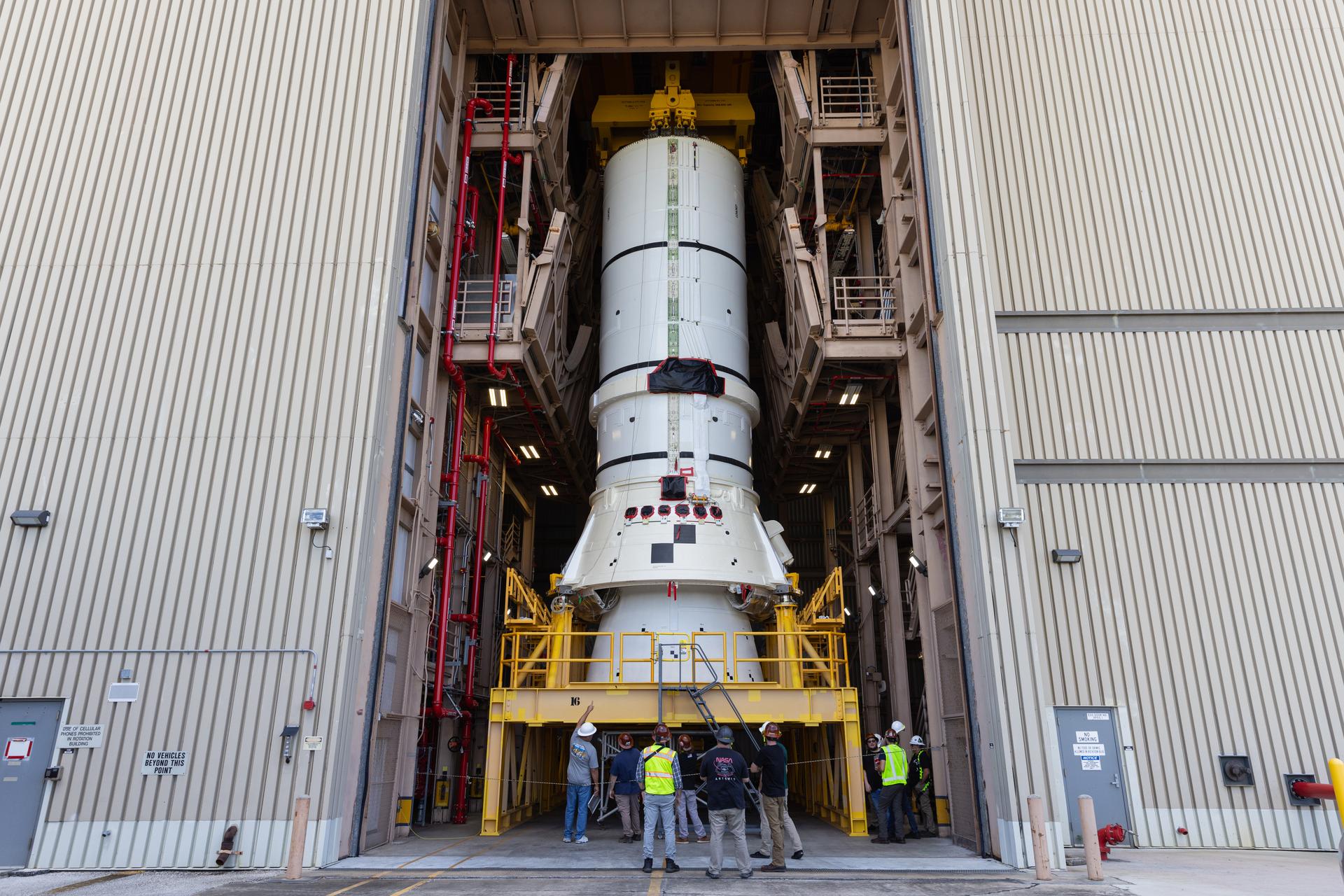 Engineers and technicians with the Exploration Ground Systems Program prepare to transfer one of the aft assemblies of the SLS (Space Launch System) solid rocket boosters for the Artemis II mission with an overhead crane inside the Rotation, Processing and Surge Facility at NASA’s Kennedy Space Center in Florida on Wednesday, Nov. 13, 2024. The booster segments are being transferred to the NASA Kennedy’s Vehicle Assembly Building via a transporter for stacking operations in preparation for launch of the Artemis II mission.