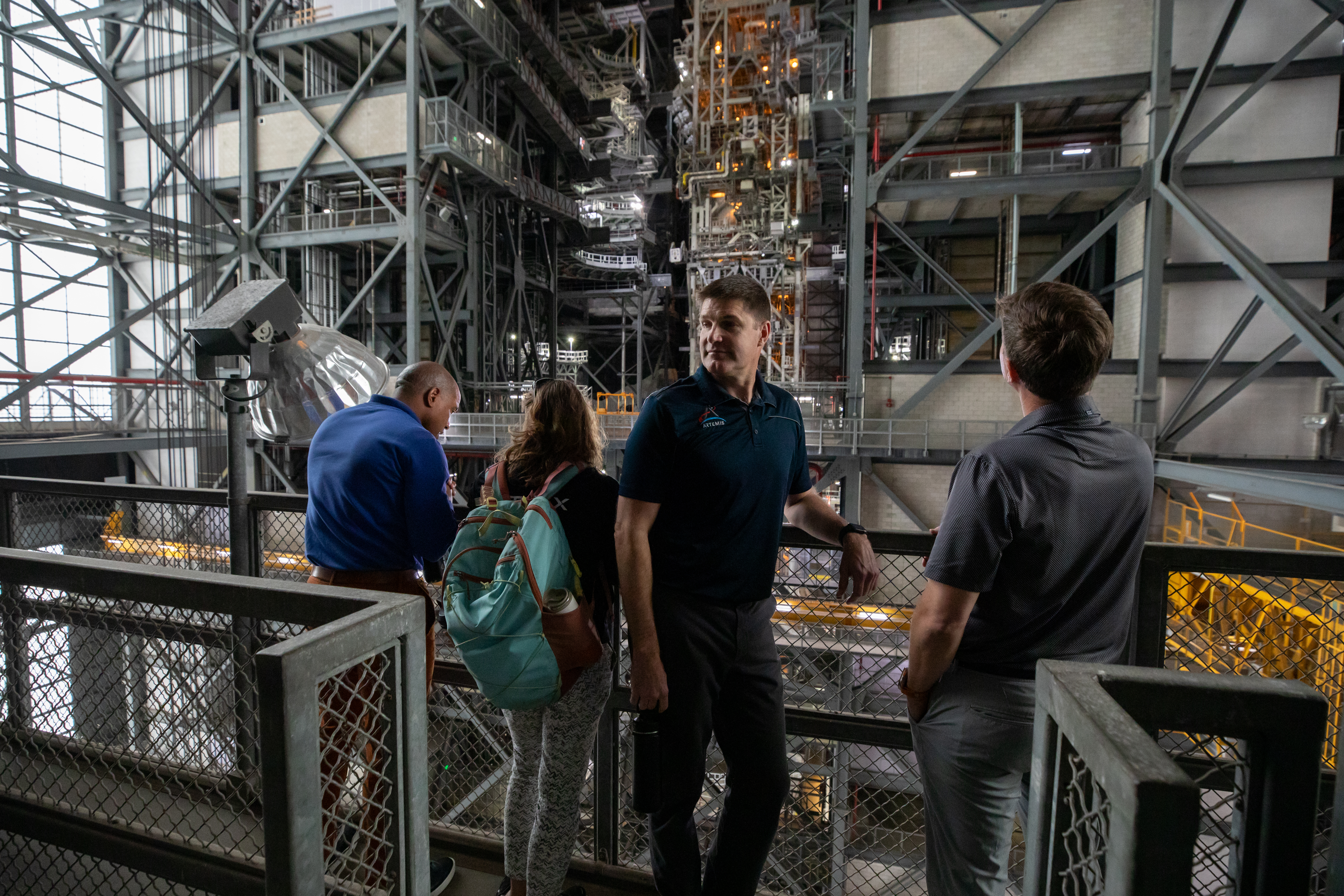 The Artemis II crew, NASA astronauts Victor Glover, left, and Christina Koch, Canadian Space Agency (CSA) astronaut Jeremy Hansen, and Reid Wiseman, right, view operations on Tuesday, Nov. 19, 2024, inside the Vehicle Assembly Building at NASA's Kennedy Space Center in Florida.