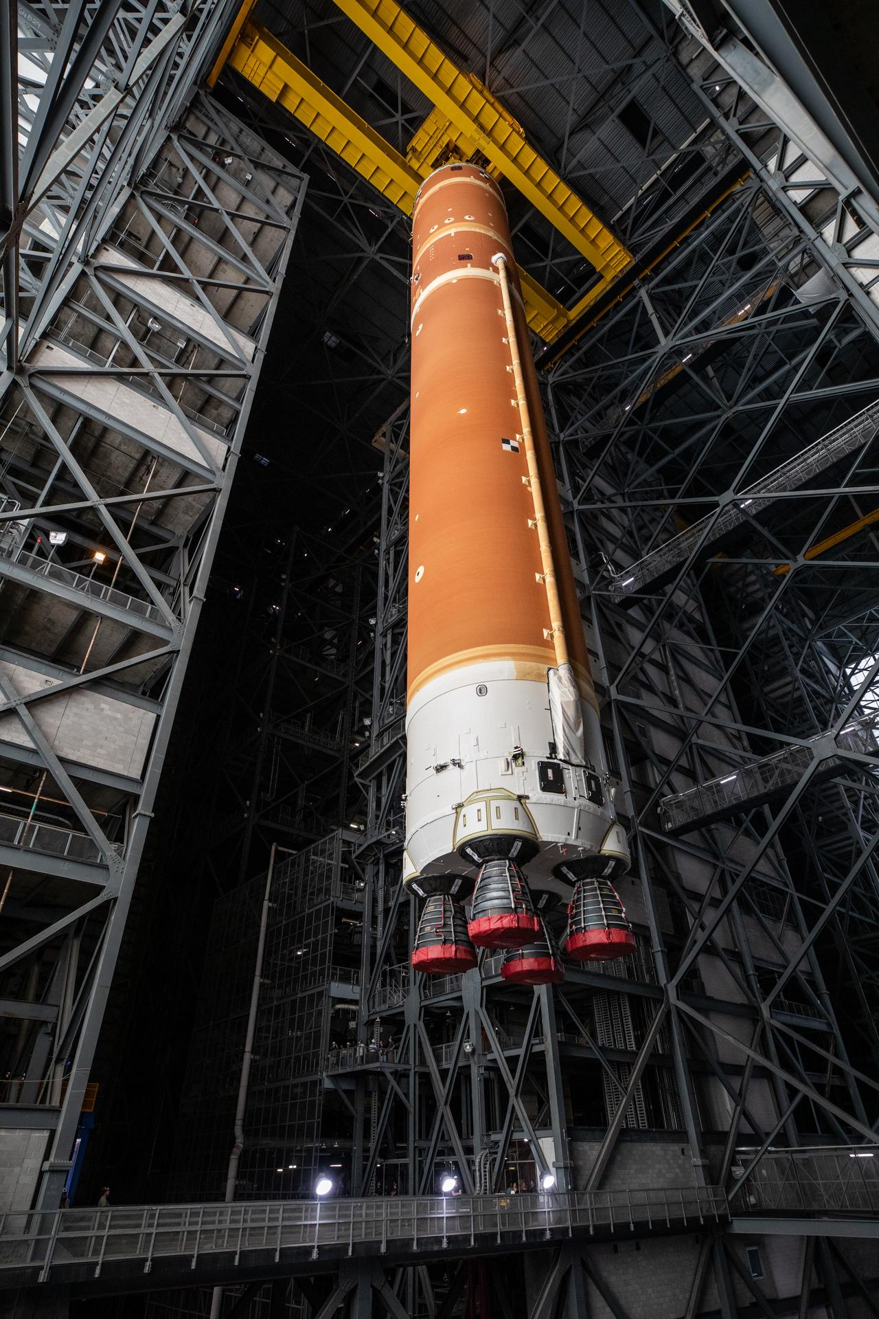 Teams with NASA’s Exploration Ground Systems transport the agency’s 212-foot-tall SLS (Space Launch System) core stage into High Bay 2 at the Vehicle Assembly Building at NASA’s Kennedy Space Center in Florida on Wednesday, Dec. 11, 2024. The one-of-a kind lifting beam is designed to lift the core stage from the transfer aisle to High Bay 2 where it will remain while teams stack the two solid rocket boosters on top of mobile launcher 1 for the SLS core stage.