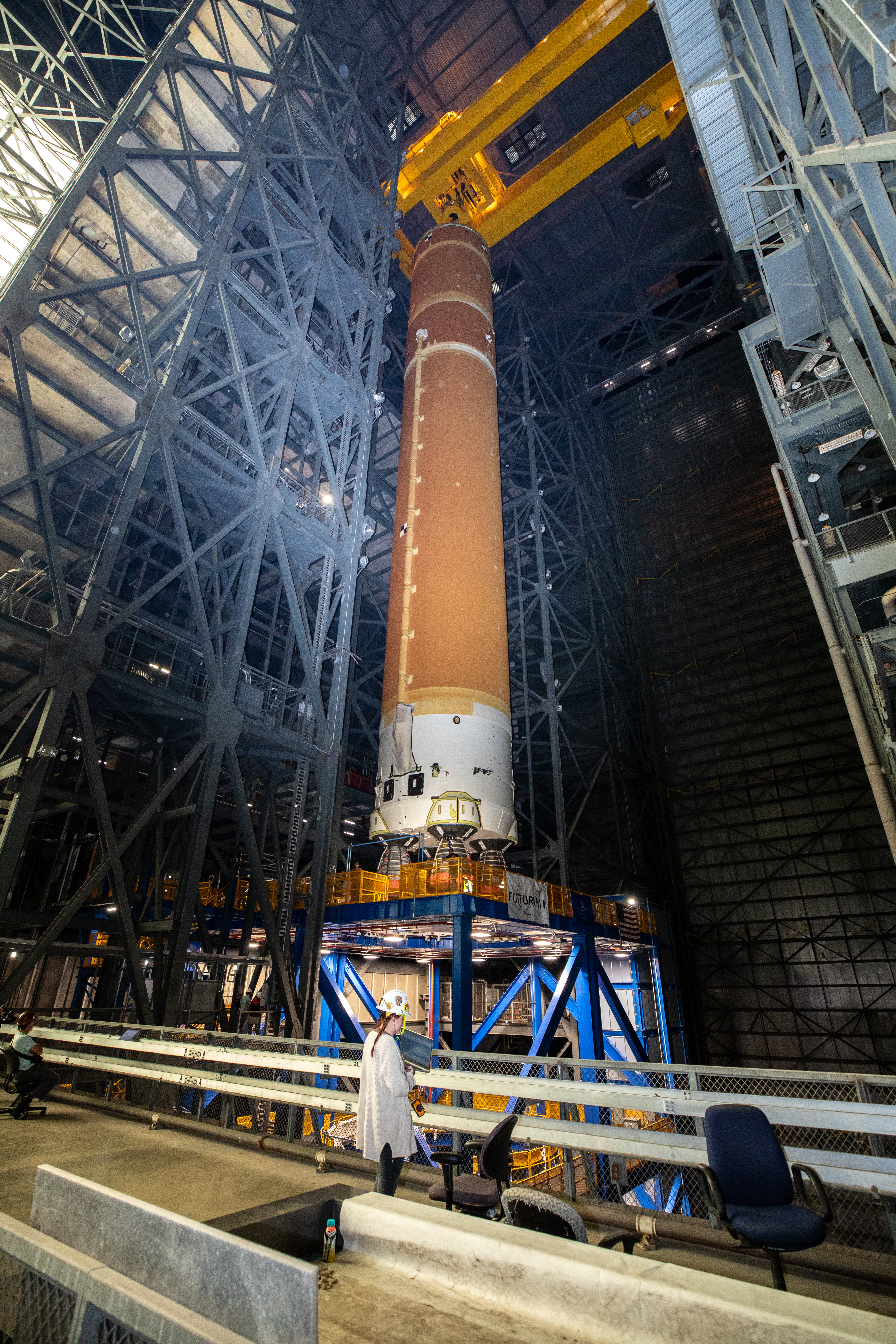 Teams with NASA’s Exploration Ground Systems transport lower the agency’s 212-foot-tall SLS (Space Launch System) core stage into High Bay 2 at the Vehicle Assembly Building at NASA’s Kennedy Space Center in Florida on Wednesday, Dec. 11, 2024. The one-of-a kind lifting beam is designed to lift the core stage from the transfer aisle to High Bay 2 where it will remain while teams stack the two solid rocket boosters on top of mobile launcher 1 for the SLS core stage. Boeing and their sub-contractor Futuramic refurbished High Bay 2 to increase efficiencies while processing core stages for Artemis II and beyond.
