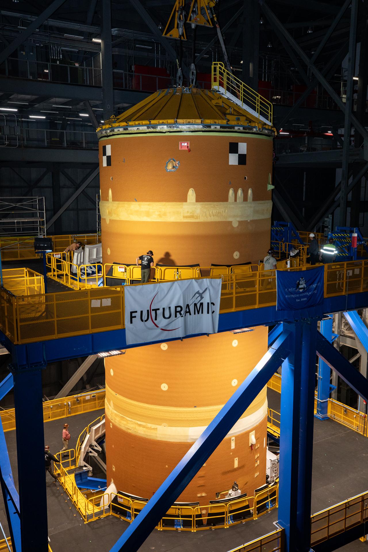 Teams with NASA’s Exploration Ground Systems transport lower the agency’s 212-foot-tall SLS (Space Launch System) core stage into High Bay 2 at the Vehicle Assembly Building at NASA’s Kennedy Space Center in Florida on Wednesday, Dec. 11, 2024. The one-of-a kind lifting beam is designed to lift the core stage from the transfer aisle to High Bay 2 where it will remain while teams stack the two solid rocket boosters on top of mobile launcher 1 for the SLS core stage. Boeing and their sub-contractor Futuramic refurbished High Bay 2 to increase efficiencies while processing core stages for Artemis II and beyond.
