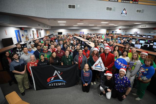 Members of the Artemis launch team pose for a holiday group photo in Firing Room 1 inside the Launch Control Center at NASA’s Kennedy Space Center in Florida on Thursday, Dec. 12, 2024. Teams participated in a cryogenic and terminal count simulation for Artemis II. The simulations go through launch day scenarios to help launch team members test software and make any necessary adjustments during countdown operations. Four astronauts will venture around the Moon on Artemis II, the first crewed mission on NASA’s path to establishing a long-term presence for science and exploration through Artemis.