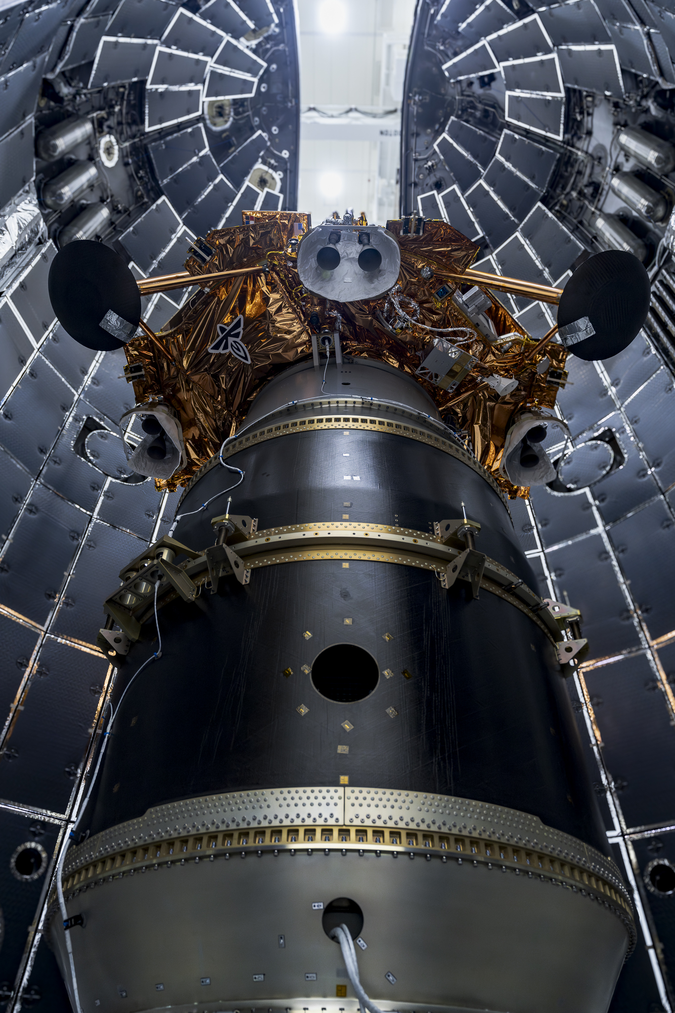 Firefly Aerospace’s Blue Ghost lunar lander is encapsulated inside SpaceX’s rocket fairing ahead of its targeted liftoff for 1:11 a.m. EST Wednesday, Jan. 15, 2025, from Launch Complex 39A at NASA’s Kennedy Space Center in Florida. Firefly’s Blue Ghost Mission 1 will be the company’s first flight to the Moon as part of the agency’s Commercial Lunar Payload Services or CLPS initiative and Artemis campaign.