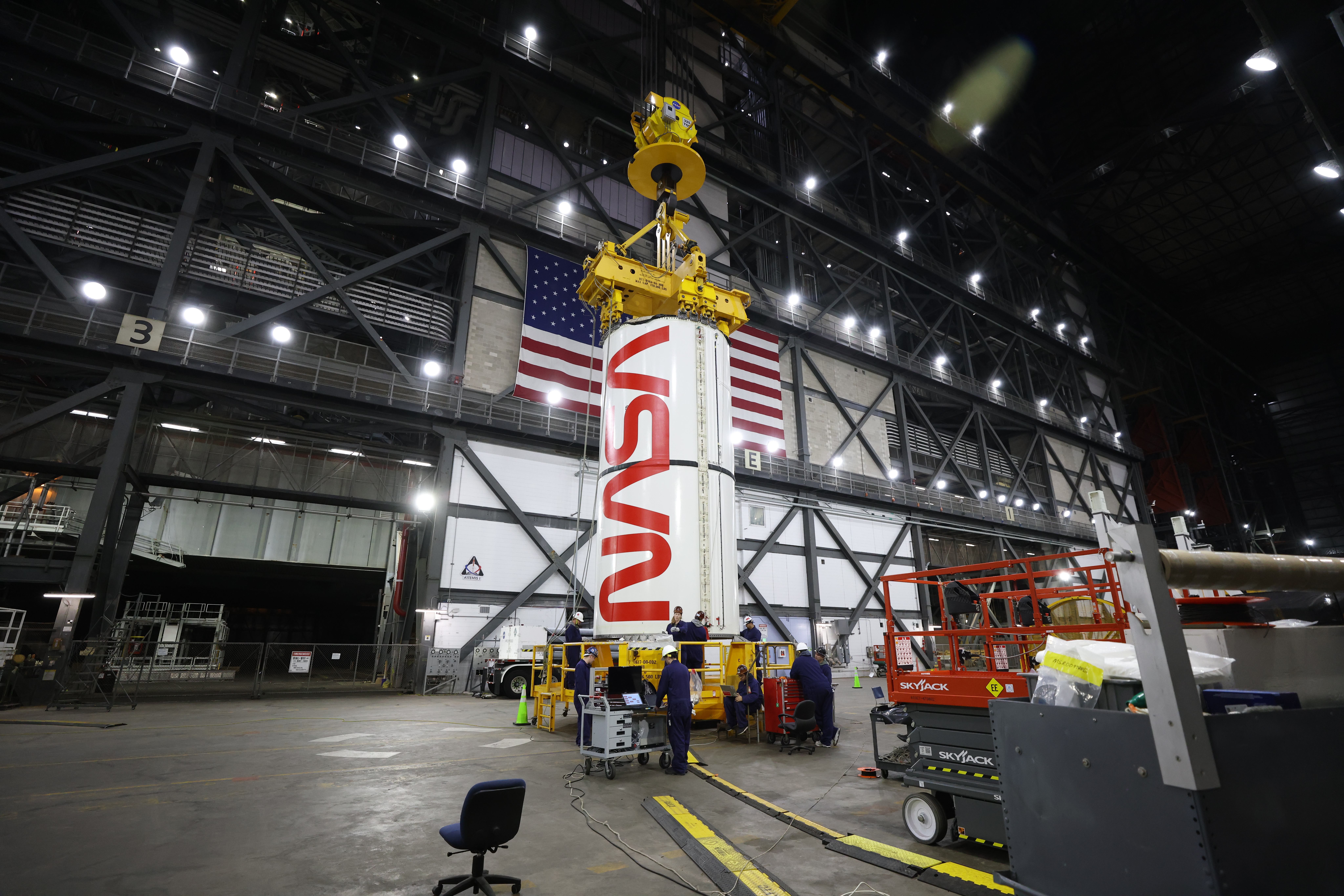 Engineers and technicians with NASA’s Exploration Ground Systems Program transfer the right center center segment with the NASA worm insignia to the Vehicle Assembly Building at NASA's Kennedy Space Center in Florida on Tuesday, Jan. 14, 2025. The booster segment is shown attached to a lifting beam ahead of integration onto the mobile launcher. The boosters will help support the remaining rocket components and the Orion spacecraft during final assembly of the Artemis II Moon rocket and provide more than 75 percent of the total SLS (Space Launch System) thrust during liftoff from NASA Kennedy’s Launch Pad 39B.