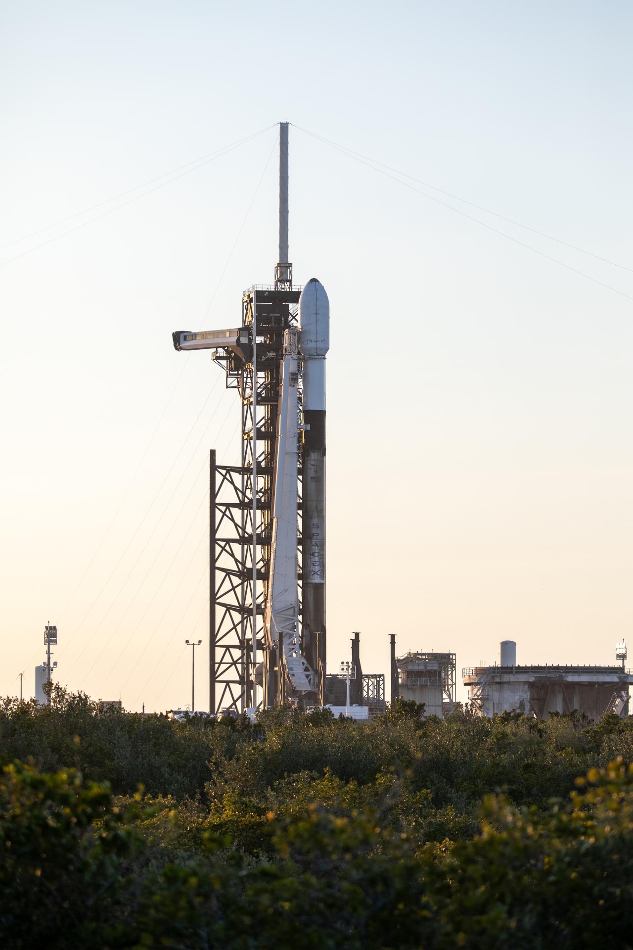 A SpaceX Falcon 9 rocket carrying Firefly Aerospace’s Blue Ghost Mission One lander prepares for a launch to the Moon on Tuesday, Jan. 14, 2025 from Launch Complex 39A at the agency’s Kennedy Space Center in Florida as part of NASA’s CLPS (Commercial Lunar Payload Services) initiative. The Blue Ghost lander will carry 10 NASA science and technology instruments to the lunar surface to further understand the Moon and help prepare for future human missions. Liftoff is targeted for 1:11 a.m. EST.
