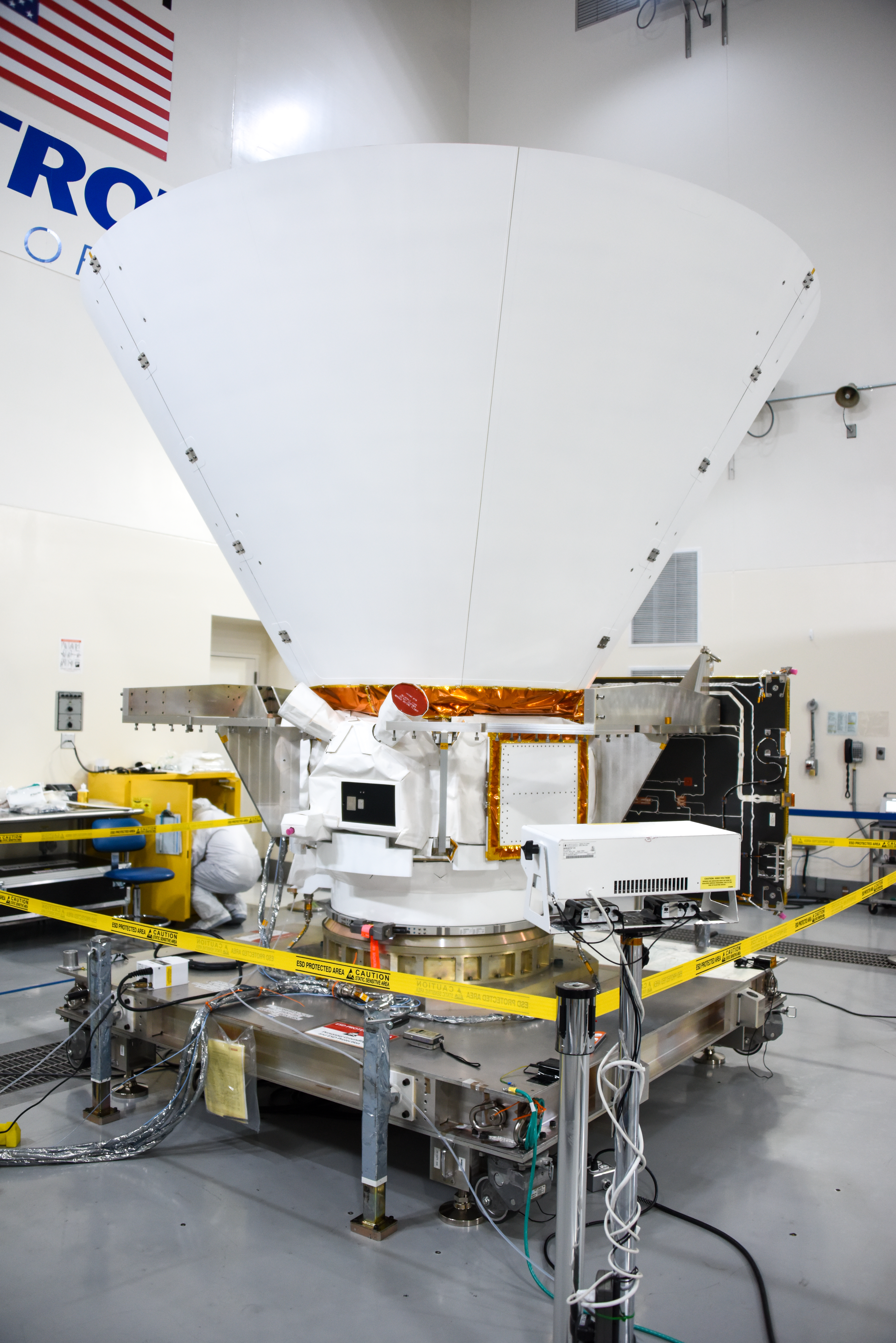 NASA’s SPHEREx (Spectro-Photometer for the History of the Universe, Epoch of Reionization and Ices Explorer), a space telescope, is situated on a work stand ahead of prelaunch operations at the Astrotech Processing Facility at Vandenberg Space Force Base in California on Friday, Jan. 17, 2025. SPHEREx will enter a polar orbit around Earth and create a 3D map of the entire sky, gathering information about millions of galaxies for scientists to study what happened after the big bang, the history of galaxy evolution, and the origins of water in planetary systems in our galaxy. SPHEREx will launch aboard a SpaceX Falcon 9 rocket in late February 2025.