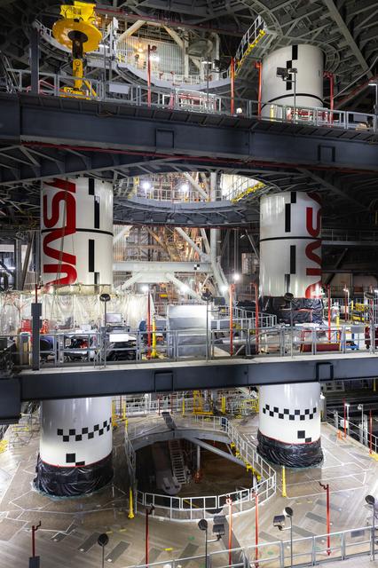 Inside High Bay 3 of the Vehicle Assembly Building at NASA’s Kennedy Space Center in Florida, technicians with the agency’s Exploration Ground Systems use a crane to lower the left center center booster segment for the NASA’s SLS (Space Launch System) rocket onto the left aft center segment atop the mobile launcher on Monday, Jan. 27, 2025. The NASA “worm” insignia can be seen on both the center center booster segments. The boosters will help support the remaining rocket components and the Orion spacecraft during final assembly of the Artemis II Moon rocket and provide more than 75 percent of the total SLS thrust during liftoff from NASA Kennedy’s Launch Pad 39B.