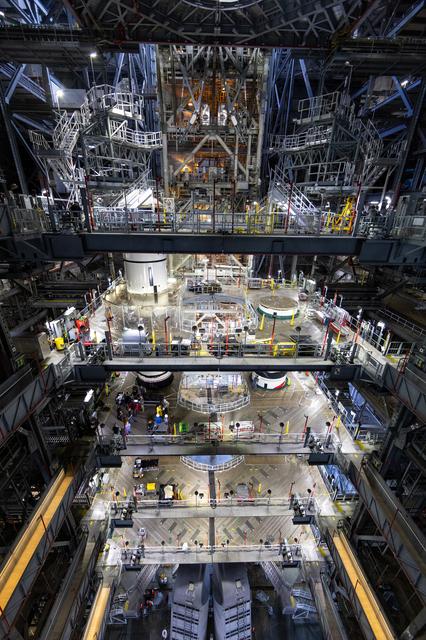 Technicians with NASA’s Exploration Ground Systems complete the integration of the left forward segment to the center forward segment on mobile launcher 1 inside the Vehicle Assembly Building at the agency’s Kennedy Space Center in Florida on Friday, Feb. 7, 2025. The twin solid boosters, five segments on each side, will help support the remaining rocket components and the Orion spacecraft during final assembly of the Artemis II Moon rocket and provide more than 75 percent of the total SLS thrust during liftoff from NASA Kennedy’s Launch Pad 39B.
