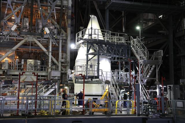Engineers with NASA’s Exploration Ground Systems complete stacking operations on the twin SLS (Space Launch System) solid rocket boosters for Artemis II by integrating the nose cones atop the forward assemblies inside the Vehicle Assembly Building’s High Bay 3 at NASA’s Kennedy Space Center in Florida on Wednesday, Feb. 19, 2025. During three months of stacking operations, technicians used a massive overhead crane to lift 10 booster segments – five segments per booster – and aerodynamic nose cones into place on mobile launcher 1. The twin solid boosters will help support the remaining rocket components and the Orion spacecraft during final assembly of the Artemis II Moon rocket and provide more than 75 percent of the total SLS thrust during liftoff from NASA Kennedy’s Launch Pad 39B.