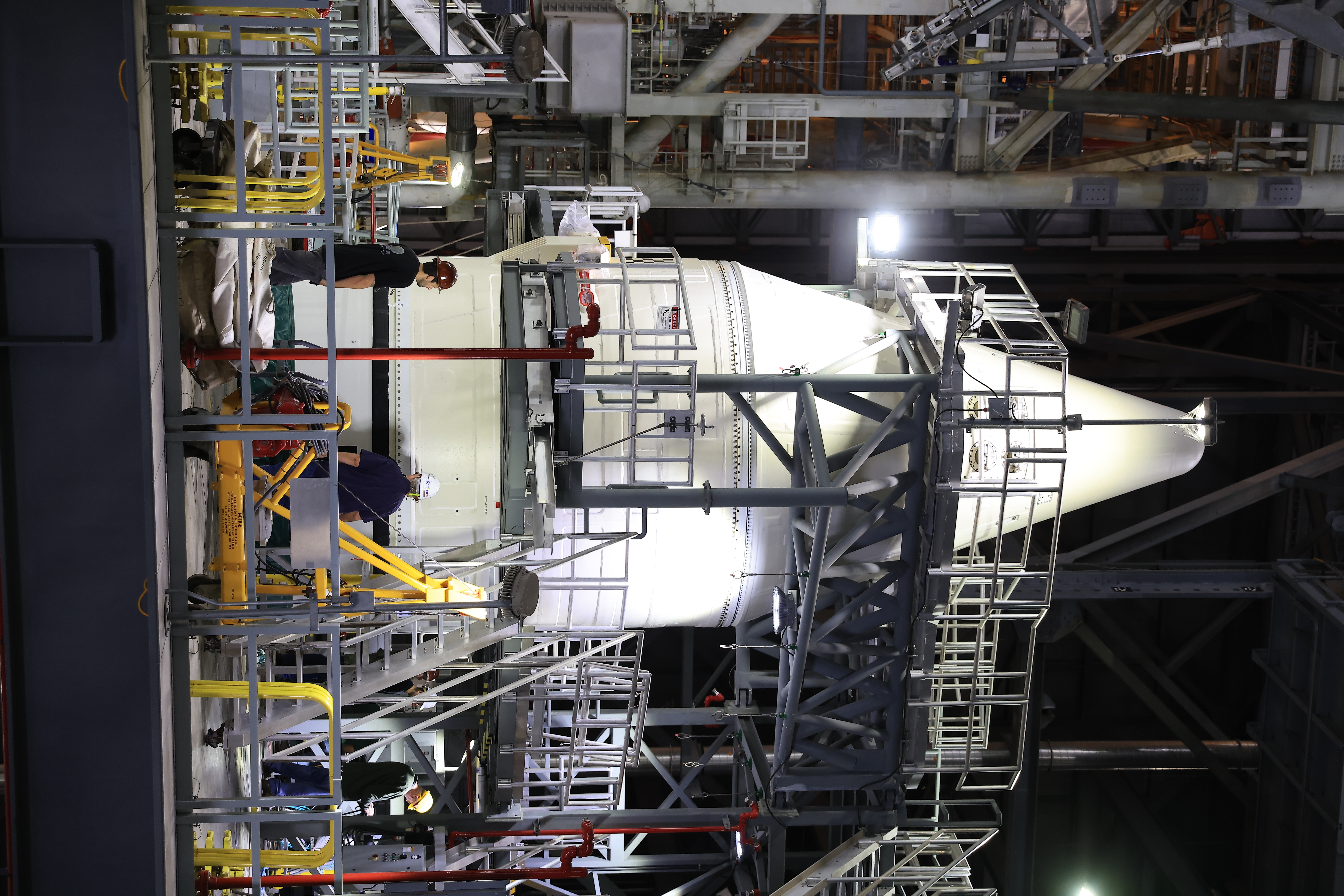 Engineers with NASA’s Exploration Ground Systems complete stacking operations on the twin SLS (Space Launch System) solid rocket boosters for Artemis II by integrating the nose cones atop the forward assemblies inside the Vehicle Assembly Building’s High Bay 3 at NASA’s Kennedy Space Center in Florida on Wednesday, Feb. 19, 2025. During three months of stacking operations, technicians used a massive overhead crane to lift 10 booster segments – five segments per booster – and aerodynamic nose cones into place on mobile launcher 1. The twin solid boosters will help support the remaining rocket components and the Orion spacecraft during final assembly of the Artemis II Moon rocket and provide more than 75 percent of the total SLS thrust during liftoff from NASA Kennedy’s Launch Pad 39B.