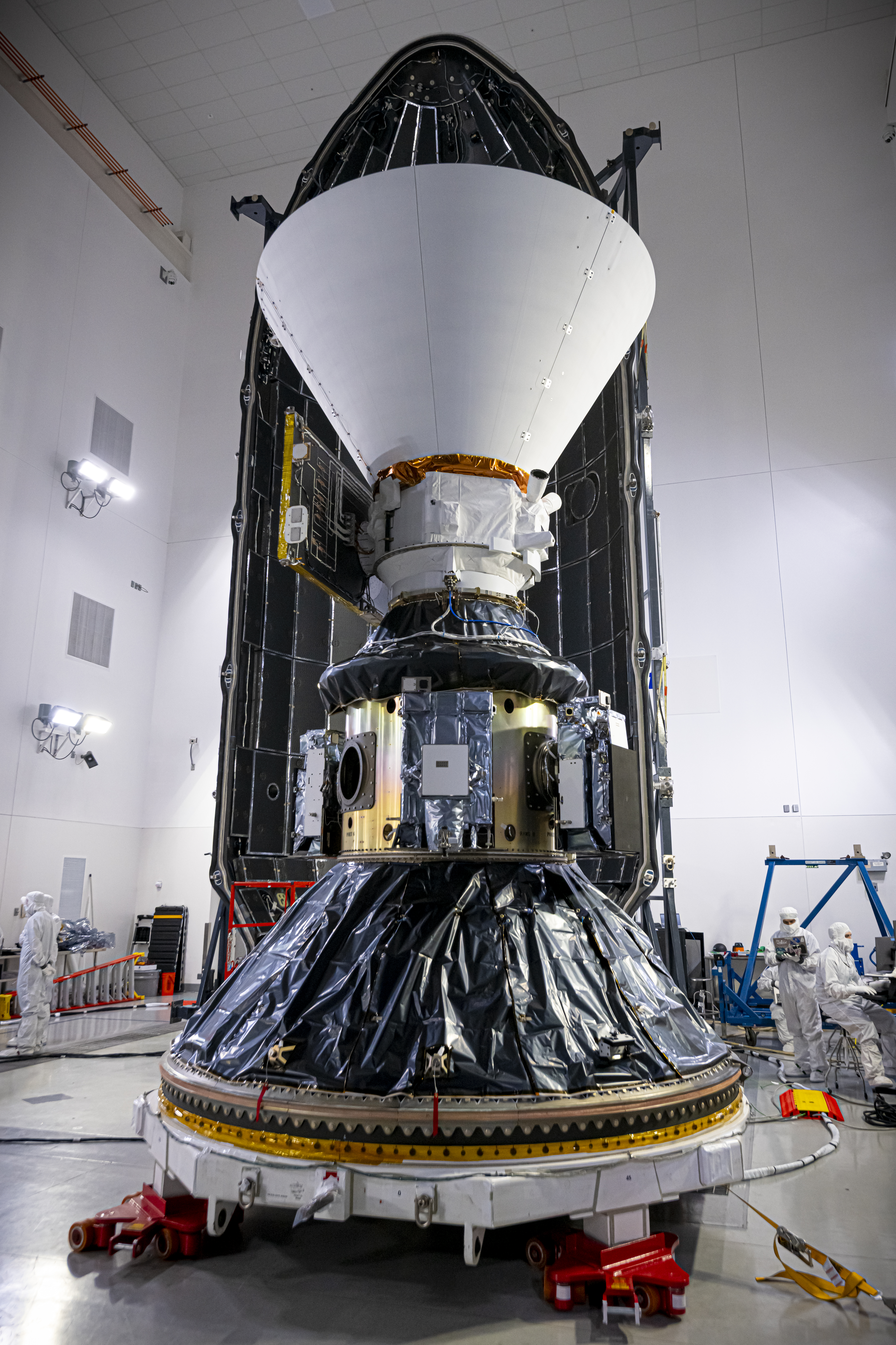 Technicians and engineers encapsulate NASA’s SPHEREx (Spectro-Photometer for the History of the Universe, Epoch of Reionization and Ices Explorer) observatory and PUNCH (Polarimeter to Unify the Corona and Heliosphere) satellites within a protective payload fairing inside the Astrotech Space Operations facility at Vandenberg Space Force Base in California, on Thursday, Feb. 27, 2025. SPHEREx will use its telescope to provide an all-sky spectral survey, creating a 3D map of the entire sky to help scientists investigate the origins of our universe. PUNCH will study origins of the Sun’s outflow of material, or the solar wind, capturing continuous 3D images of the Sun’s corona and the solar wind’s journey into the solar system. Liftoff aboard a SpaceX Falcon 9 rocket is targeted for NET 10:09 EST (7:09 p.m. PST), Tuesday, March 4, 2025, at Space Launch Complex 4 East from Vandenberg Space Force Base in California.