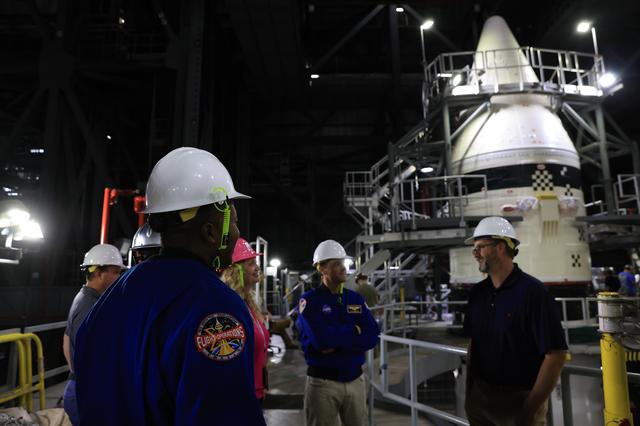 From left, NASA astronauts Andre Douglas, Artemis II backup crew member, and Artemis II astronaut Reid Wiseman, commander; and Artemis team members tour the twin SLS (Space Launch System) solid rocket boosters for Artemis II inside the Vehicle Assembly Building at NASA Kennedy on Thursday, Feb. 27, 2025. For Artemis II, four astronauts will venture around the Moon, the first crewed mission on NASA’s path to establishing a long-term presence for science and exploration through Artemis.
