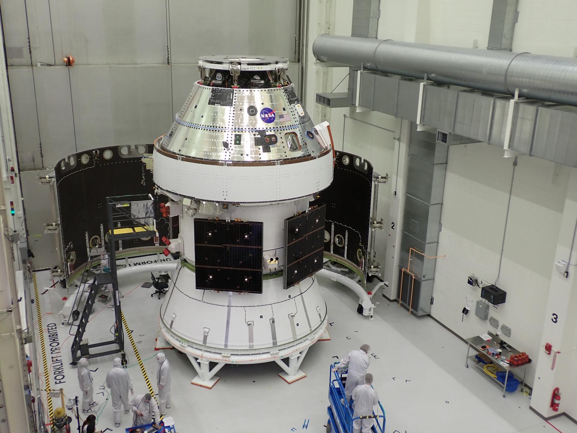 Technicians with Lockheed Martin prepare the Artemis II Orion spacecraft for the installation of three spacecraft adapter jettison fairings inside the Neil A. Armstrong Operations and Checkout Building at NASA’s Kennedy Space Center in Florida in on Tuesday, March 11, 2025. The fairings encapsulate the service module and protect the solar array wings, shielding them from the heat, wind, and acoustics of launch and ascent, plus help redistribute the load between Orion and the massive thrust of the SLS (Space Launch System) rocket during liftoff and ascent. Once the spacecraft is above the atmosphere, the three fairing panels will separate from the service module reducing the mass of the spacecraft.
