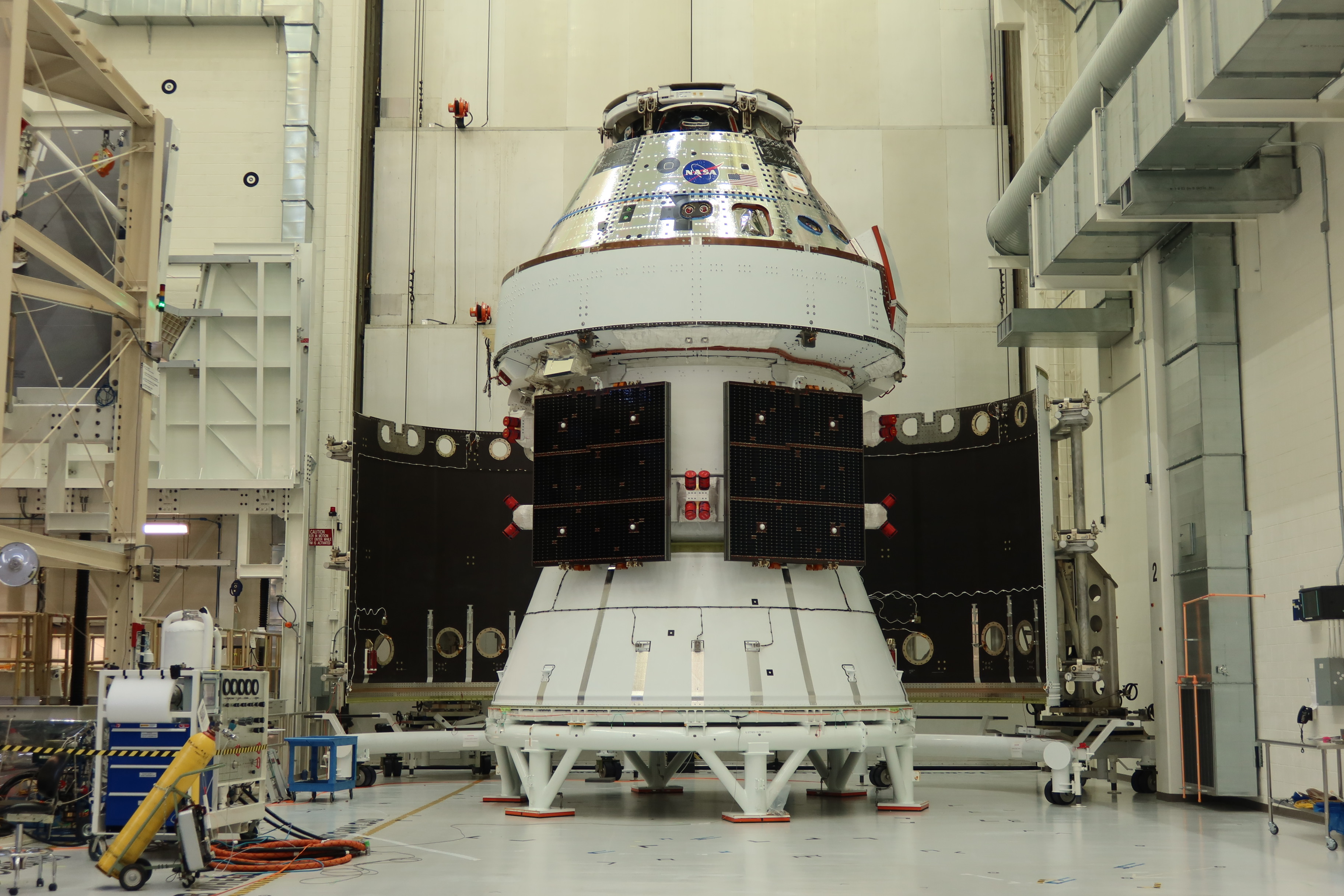 The Artemis II Orion spacecraft sits in the transfer aisle in the Neil A. Armstrong Operations and Checkout Building at NASA’s Kennedy Space Center in Florida in preparation for the installation of three spacecraft adapter jettison fairings on Tuesday, March 11, 2025. The fairings encapsulate the service module and protect the solar array wings, shielding them from the heat, wind, and acoustics of launch and ascent, plus help redistribute the load between Orion and the massive thrust of the SLS (Space Launch System) rocket during liftoff and ascent. Once the spacecraft is above the atmosphere, the three fairing panels will separate from the service module reducing the mass of the spacecraft.
